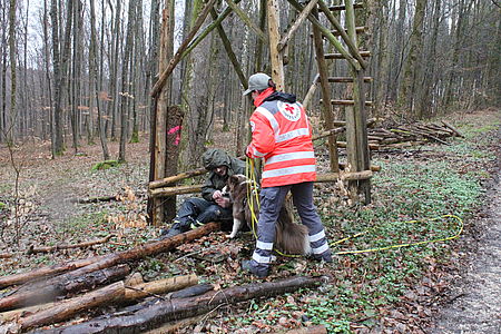 Drei Vermisste, die wahrscheinlich medizinische Hilfe benötigen, müssen in einem weitläufigen Waldstück gefunden werden. Diesem Szenario stellten sich die Rettungshundeteams des DRK-Kreisverbandes bei einer Übung am Helenenhof.