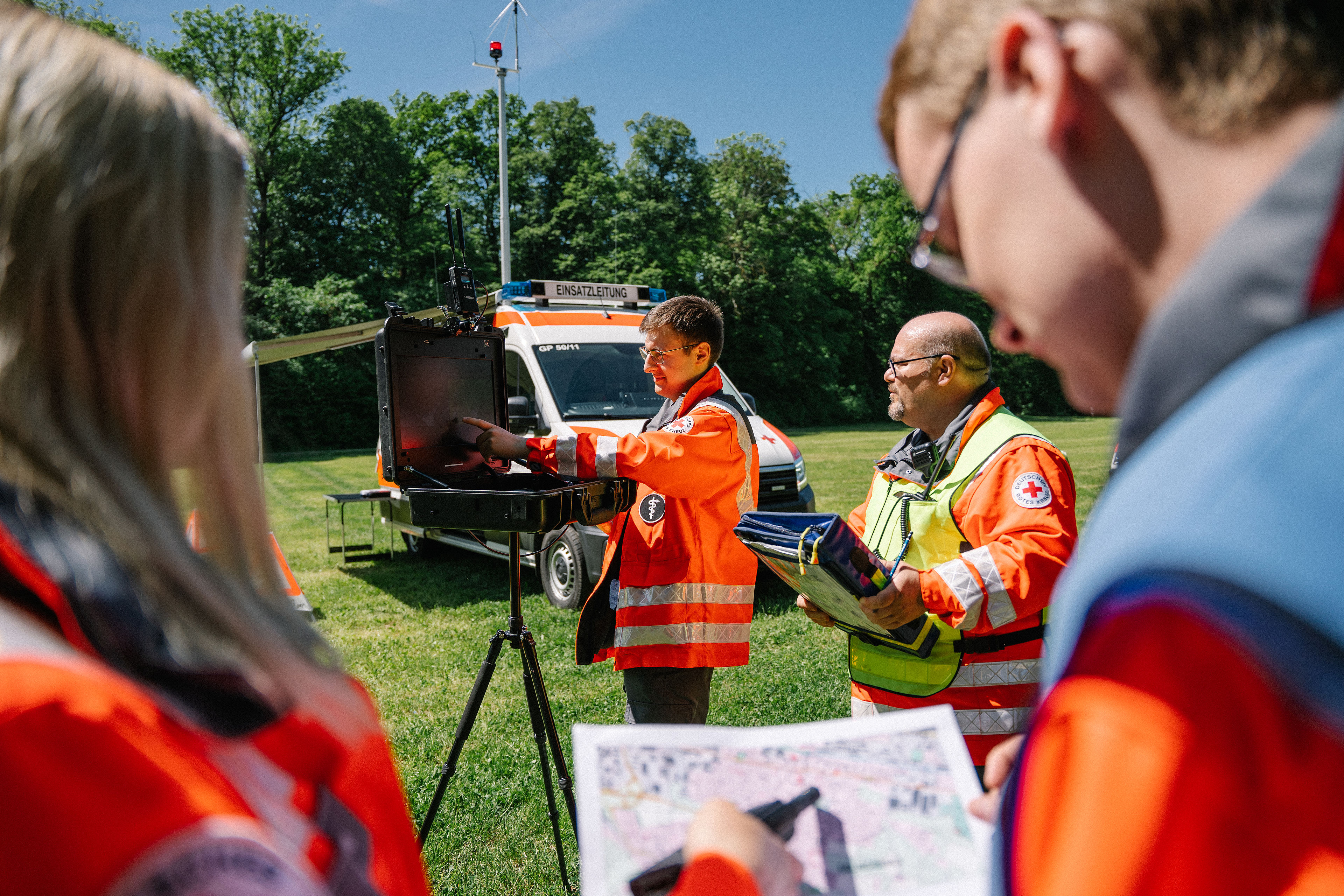 Wir arbeiten mit modernen Kommunikationsmitteln im Schadensgebiet und im Gebäude des Kreisverbands in Göppingen und sind im Ernstfall bundesweit vernetzt.