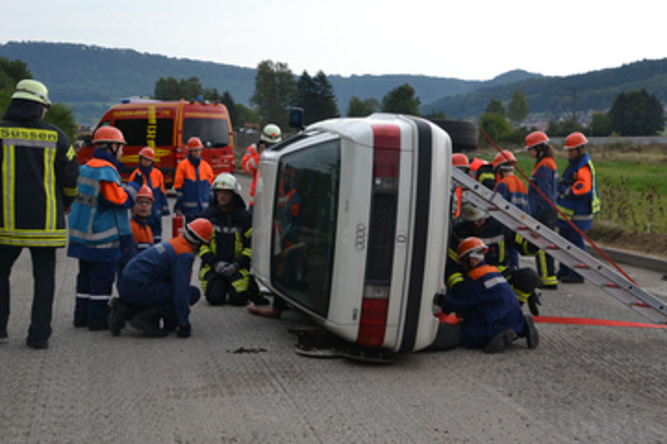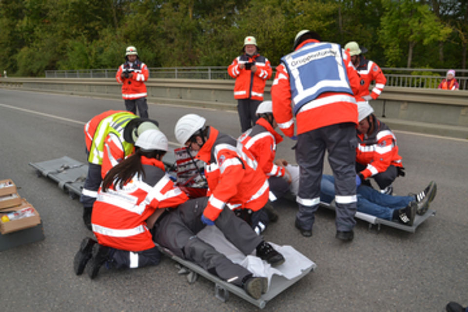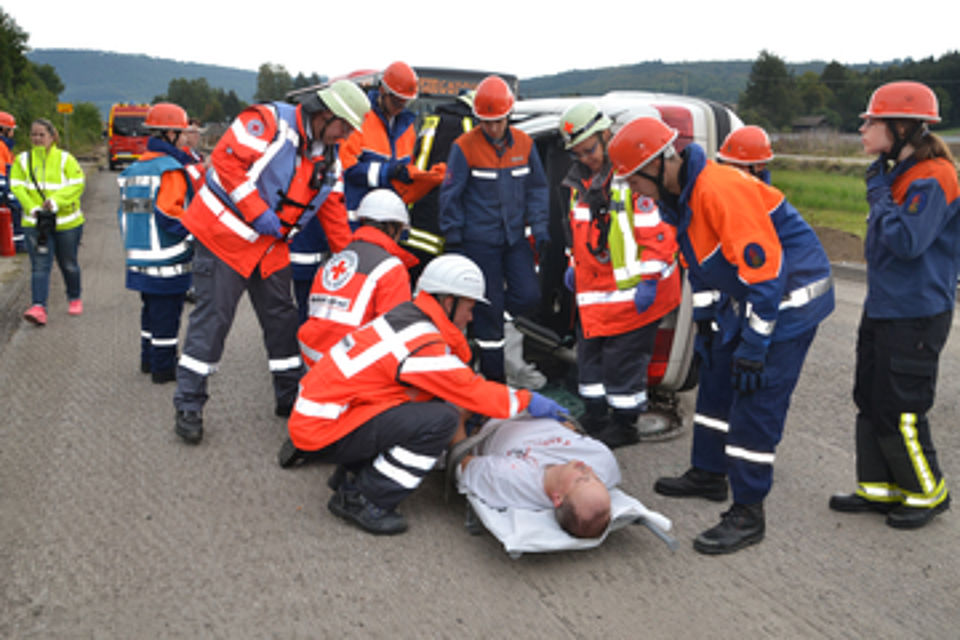 „Kommen sie schnell, ein Auto liegt auf der B466 am Ortsausgang von Süßen auf der Seite und die beiden Insassen bekomme ich nicht raus“, so lautet der Notruf, der bei der Feuerwache in Süßen eingeht. Die vier Jugendrotkreuzler vom DRK Ortsverein Mittleres Fils- und Lautertal springen mit ihren Kollegen von der Jugendfeuerwehr Süßen in die Einsatzfahrzeuge und fahren mit Blaulicht und Martinshorn zum Unfallort. Vor Ort weiß jeder, was zu tun ist. Der Nachwuchs der Feuerwehr sichert die Unfallstelle und nimmt Kontakt mit den Personen im Fahrzeug auf. „Du darfst jetzt da runter und mit ihm reden“, weist ein Feuerwehrmann einen Jungen im Feuerwehranzug an, der auch gleich auf die Knie geht und der eingeklemmten Person erklärt, dass der Rettungsdienst gleich kommt. Der bereitet sich etwas abseits vom Unfallwagen auch schon auf den Einsatz vor. Die Tragen werden hergerichtet und die nötige Ausrüstung daneben bereit gelegt. „Seid ihr startklar?“ fragt die Einsatzleiterin Petra Piwonka, stellvertretende Bereitschaftsleiterin des DRK Mittleres Fils- und Lautertal, die Jugendsanitäter. Die vier Jugendlichen zwischen 14 und 16 Jahren nehmen die beiden Tragen und eilen zum verunglückten Auto.
