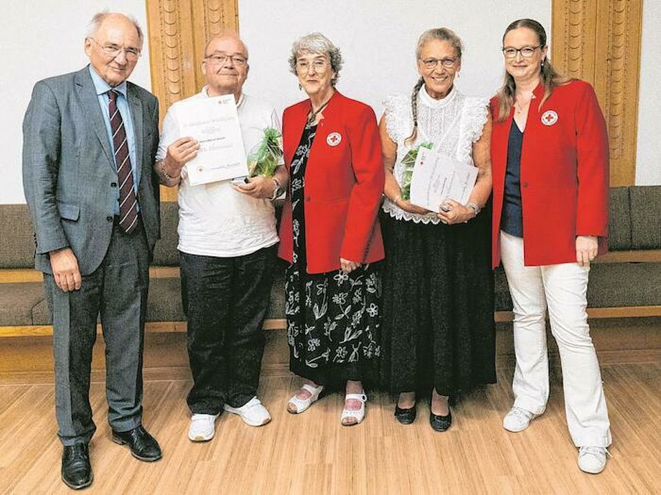Sage und schreibe 60 Jahre ist Werner Gewehr dem Roten Kreuz verbunden. „Sie sind das Sinnbild für das, was ich schon als kleines Kind mit dem DRK verbunden habe“, betonte Peter Hofelich. Heidi Hagel gehört dem DRK seit 50 Jahren an.