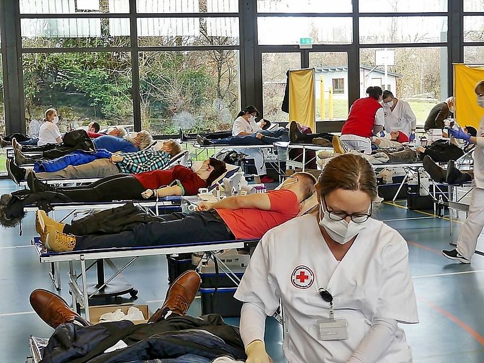 Großzügig verteilen sich die Durchgangsstationen, Liegen und Wartezonen in der Sillerhalle. „Es wird sehr, sehr, positiv aufgenommen“, freut sich DRK-Bereitschaftsleiterin Bettina Steinbacher. 272 Blutspender haben sich in einer Zeitspanne von viereinhalb Stunden angemeldet. „Einmal links“, ruft eine der 17 ehrenamtlichen DRK-Helferinnen und Helfer. Teilt den Wartenden damit mit, dass soeben für einen Rechtshänder eine Liege frei geworden ist. „Man sollte nicht die dominierende Seite wählen, aber auch die Qualität der Venen spielt eine Rolle“, erklärt sie dem Erstlingsspender.