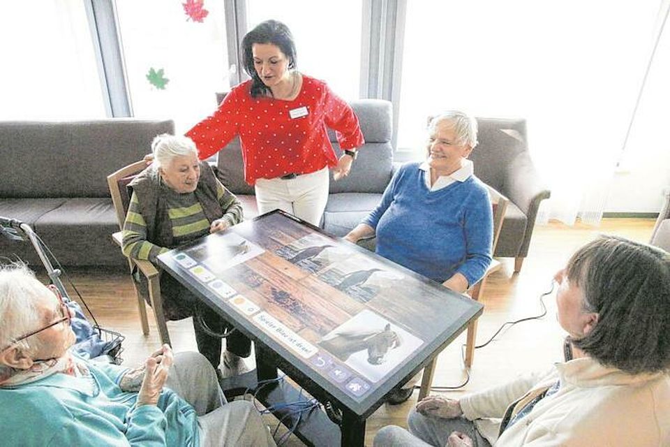 Ein Besuch im Gemeinschaftsraum des DRK-Seniorenzentrums bestätigt das. Betreuungskraft Marianne Zagorac fragt in die Gruppe der Bewohner, die gerade im Nebenraum Kaffee trinken, wer Lust auf eine Runde Memory mit dem Aktivtisch hat und sofort finden sich drei, später vier Mitspielerinnen im Gemeinschaftsraum ein und versammeln sich um den Tisch. Dessen Oberfläche ist das Display.