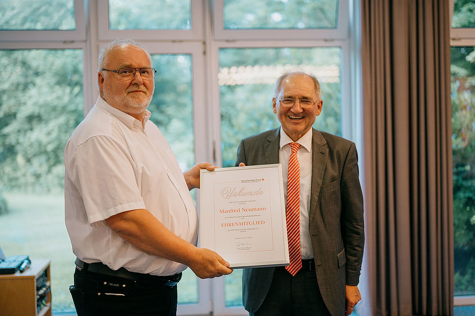 Manfred Neumann hat seit 1975 eine Vielzahl von Ämtern und Funktionen innerhalb des Kreisverbands wahrgenommen. Er war u.a. Gruppenführer, Bereitschaftsleiter, Kreisausbildungsleiter, Rotkreuzbeauftragter und Vertreter der Ortsvereine im Kreisverbandspräsidium. Er ist Vorsitzender des auf seine Initiative hin gegründeten Ortsverein Mittleres Fils- und Lautertal, Leiter der Rotkreuz-Senioren und Leiter des Therapiehundeteams. Darüber hinaus engagiert er sich unter anderem als Erste Hilfe-Ausbilder und Helfer vor Ort.