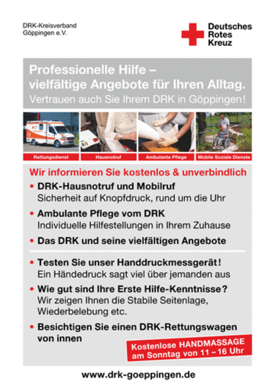 „Rundum versorgt – dieses Motto ist uns allen Verpflichtung“, betont Ute Kothe, Leiterin des vor drei Jahren gegründeten ambulanten Dienstes. „Wir wollen aber nicht nur die Leistungen des Pflegedienstes sowie unseren Hausnotruf und Mobilruf vorstellen, sondern darüber hinaus an unserem Messestand den Messebesuchern ein abwechslungsreiches und informatives Programm bieten“, ergänzt Birgit Dibowski, Leiterin der Sozialarbeit beim Kreisverband Göppingen. „Sie können einen Blick ins Innere eines Rettungswagens werfen, sich in Erster Hilfe an einer Übungspuppe probieren oder Ihren Handdruck messen lassen. Zur Entspannung werden unsere qualifizierten Mitarbeiterinnen vom DRK-Seniorenzentrum Hattenhofen am Sonntag eine wohltuende Handmassage anbieten.“