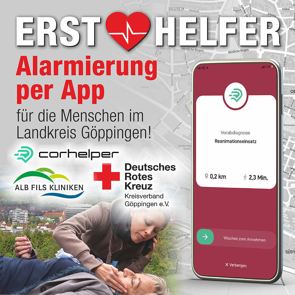 AFK und DRK schildern, wie wichtig schnelles Handeln ist: Erleidet ein Mensch einen Herz-Kreislauf-Stillstand, wird der Notarzt alarmiert, der schnell vor Ort sein soll, um Hilfe zu leisten. Noch schneller könnten qualifizierte Ersthelfer lebensrettende Maßnahmen ergreifen. Bei einem Herz-Kreislauf-Stillstand ist Zeit ein wichtiger Faktor. „Ohne Reanimationsmaßnahme sinkt die Überlebenschance eines Patienten pro Minute um zehn Prozent“, stellt Professor Dr. Matthias Fischer, stellvertretender DRK-Kreisverbandspräsident und Chefarzt der Alb-Fils-Kliniken, fest. Erste-Hilfe-Kurse und das Helfer-vor-Ort-System wirkten dem seit vielen Jahren entgegen. Vor gut zwei Jahren hätten im Landkreis das Rote Kreuz und die Alb-Fils-Kliniken ein weiteres Instrument geschaffen, das Hilfe noch schneller vor Ort bringt. Über die „Corhelper-App“ werden entsprechend ausgebildete Ersthelfer, die sich im nahen Umfeld des Notfalles aufhalten, alarmiert, sowie ein entsprechender Notruf bei der Integrierten Leitstelle eingegangen ist. Um ein flächendeckendes Netz von entsprechend vorbereiteter Ersthelfer aufzubauen, braucht es etwa 1500 registrierte Ersthelfer, heißt es in der Pressemitteilung. Das DRK wirbt deswegen dafür, sich registrieren zu lassen, um Teil des Hilfeangebots zu werden.