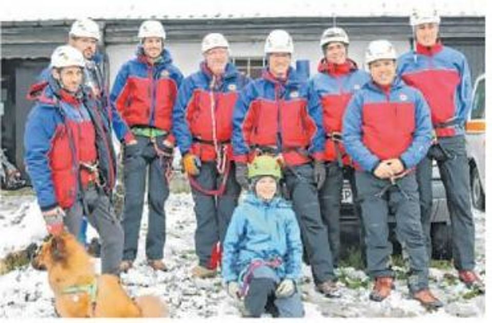 Dieses Übungsbild bot sich den Göppinger Bergrettern auf der Suche nach dem genauen Einsatzort, von dem eine Frau stürzte. Wenig später gelangte der erste Bergretter zur Patientin, sicherte sie gegen weiteres Abstürzen und begann mit der medizinischen Erstversorgung. Währenddessen bereiteten alle anderen Bergretter die Ausrüstung für die Rettung aus der Felswand vor. Im Graupelschauer konnte dann, von zwei Seilen gesichert, die Gebirgstrage mit einem weiteren Retter die ungefähr 15 Meter hinabgelassen werden. Mit der Trage auf Höhe des Absatzes fixiert, war es möglich, die Frau aufzunehmen und mit der Vakuummatratze bestmöglich zu immobilisieren. Mit zwei Rettern an der Trage seilten die Bergretter an den Sicherungsgeräten ihre Kollegen weitere 40 Meter bis zum Wandfuß ab. Etwas mehr als eine Stunde nach Auffinden der Patientin war diese trotz aufwändiger Rettung auf einem Waldweg angekommen.