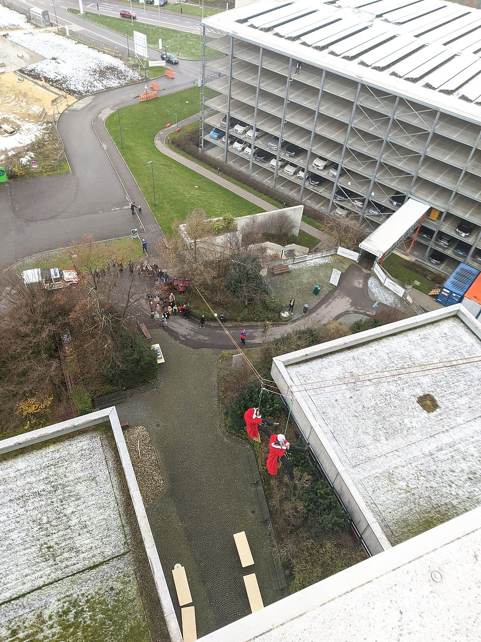 Chefarzt Dr. Fabian Kaßberger bedankte sich bei den Akteuren für die tolle Idee und ihren Besuch und ihr Engagement. Beim Abstieg der Weihnachtsmänner winkten zahlreiche Patientinnen und Patienten diesen zu, während sie an den Fenstern der Patientenzimmer vorbei schwebten.