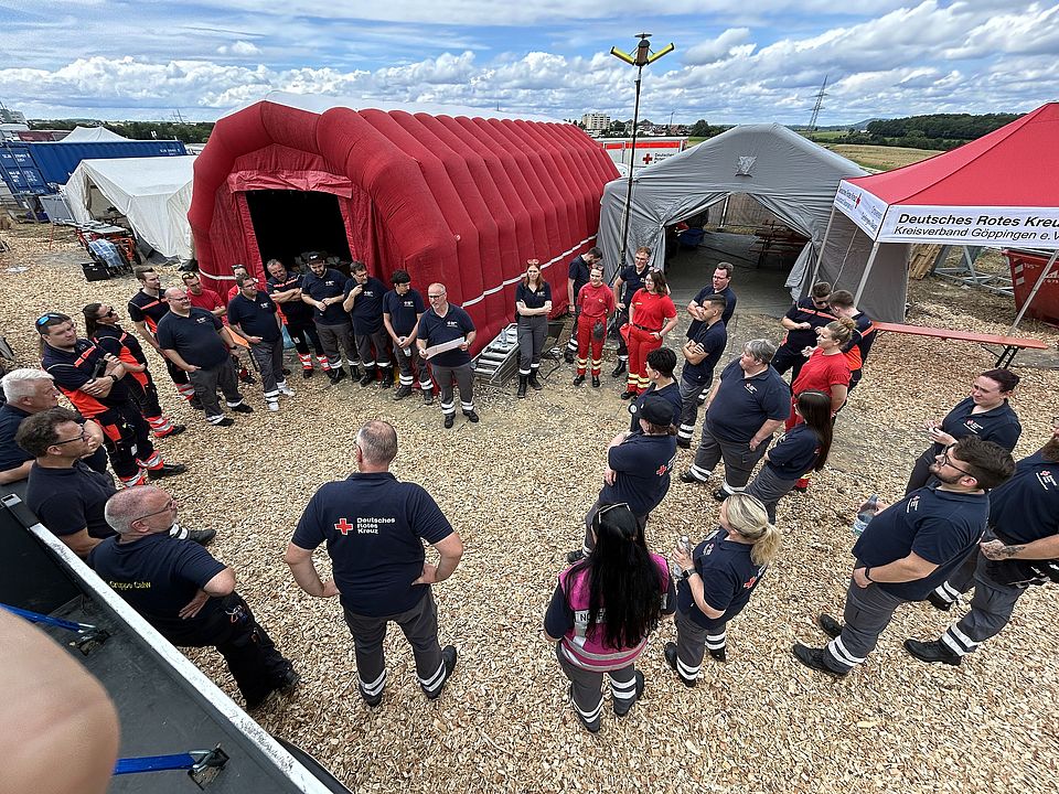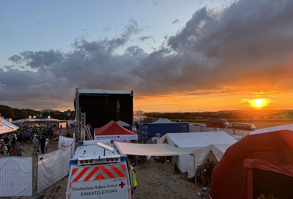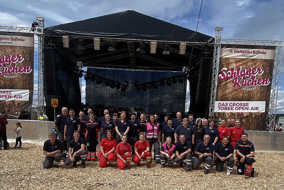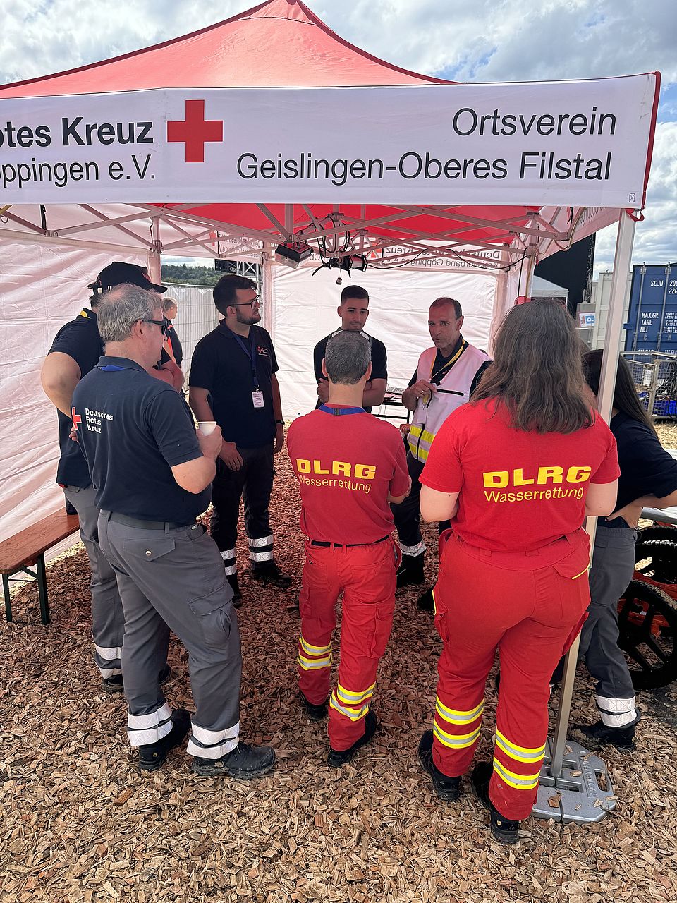 „In diesem Jahr fand der Schlagerkuchen, nicht wie in den Jahren zuvor in Fußballstadien statt, sondern auf einem frisch abgemähten Stoppelacker. Es gab also überhaupt keine Infrastruktur“, berichtet Raimund Matosic. Er hatte 38 Einsatzkräfte aus den DRK-Ortsvereinen Geislingen-Oberes Filstal (zwölf Einsatzkräfte und drei Ärzt*innen), Eislingen (sieben Einsatzkräfte und der Einsatzleitwagen), Böhmenkirch (zwei Einsatzkräfte), Hattenhofen-Voralb (eine Einsatzkraft) und Göppingen-Schurwald (eine Einsatzkraft) sowie das PSNV-Team (drei Einsatzkräfte) für diesen besonderen Einsatz gewinnen können. Außerdem war die Ortsgruppe Donzdorf der DLRG mit fünf Einsatzkräften und der DRK-Rettungsdienst mit sechs Mitarbeitenden vor Ort.