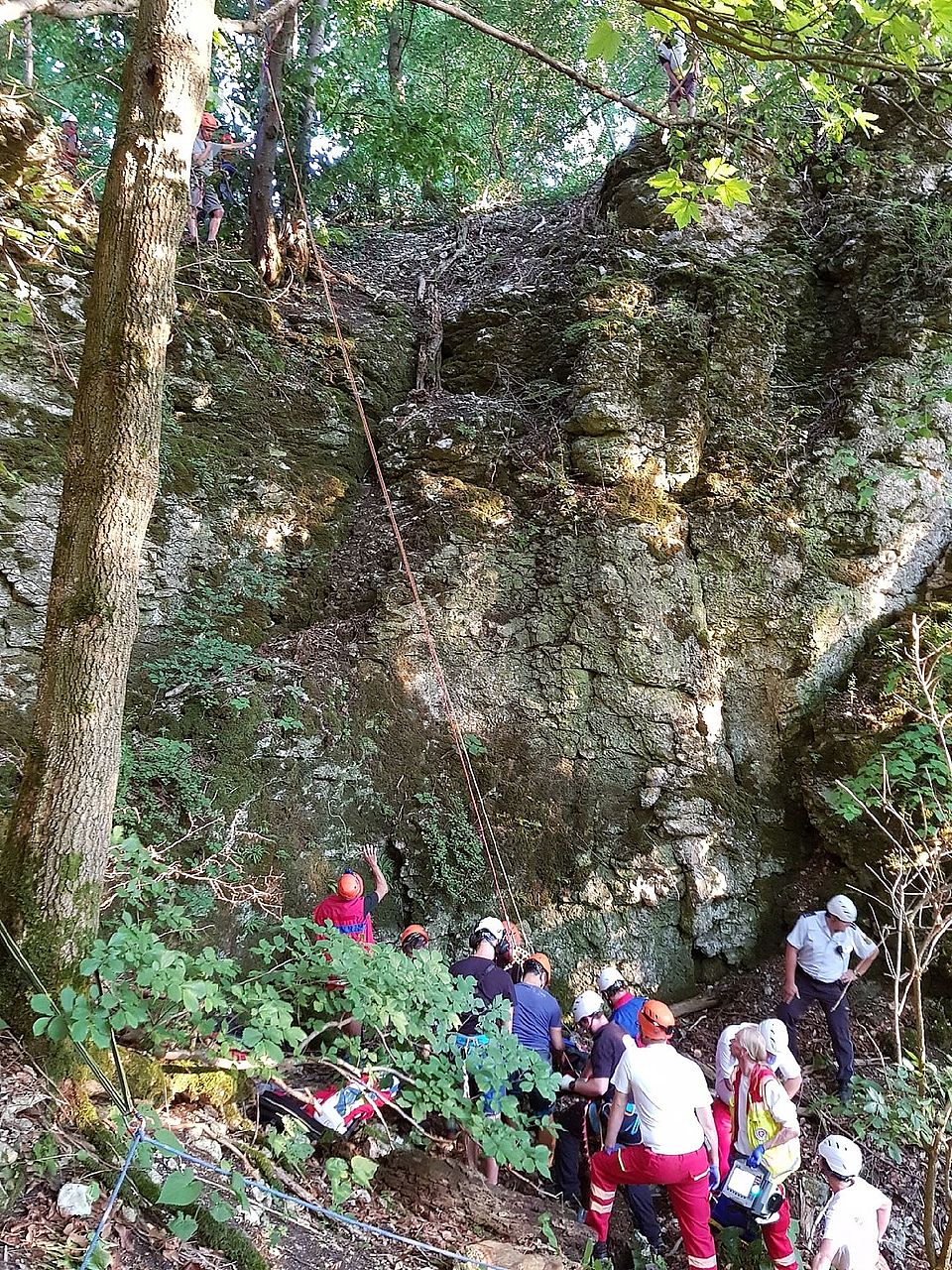 Nach der Stabilisierung des Verletzten in der Vakuummatratze und Versorgung mit Schmerzmitteln und Sauerstoff, begann die schwierige Rettung. Im Bergesack der Bergwacht liegend, an den beiden Statikseilen hängend, wurde der Patient mit einem Bergretter die Felswand hinaufgezogen. Dafür mussten die Seile an einem über den Fels ragenden Baum umgelenkt werden und ein Flaschenzug eingebaut werden. Nach Erreichen des Felskopfes ging es weiter von Seilen gesichert durch das steile Gelände in Richtung Waldrand.