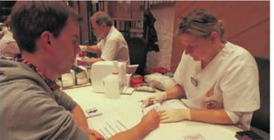 Mit einem Stupfer in die Fingerkuppe prüft Jutta Rißmann (rechts) vom DRK-Blutspendedienst das Hämoglobin im Blut von Manuel Renz. Der Reichenbacher spendete gestern in der Jahnhalle zum 18. Mal Blut.
