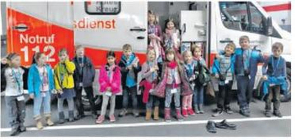 Im Notarztwagen darf hinterm Steuer Probe gesessen werden. „Sie zeigte uns, wie man die Autos steuert“, freut sich Lea. Wir waren fasziniert, der Wagen ist an ein Stromkabel angeschlossen. Wird er elektrisch betrieben? Nein, es gibt darin viele Geräte zur Rettung, die mit Strom versorgt werden. Frida erzählt später: „Wir durften einen Rettungswagen von innen anschauen, dort gibt es eine große Liege“. Das Tragetuch auf der Liege wird von uns getestet. „Und es gibt einen Stuhl, wie ein Rollstuhl mit Tragegriffen zum ausziehen“, ergänzt Timo. Wussten sie schon, wenn eine Nadel in die Hand gesteckt wird, dass nur das Plastikröhrchen in der Hand bleibt, die Nadel wird wieder raus gezogen? Mia H. war fasziniert, wie das mit der Infusion funktioniert. „Eine Atempumpe/Beatmungsmaske gibt es auch“, fällt Leonard auf. „Wenn der Mensch nicht mehr atmet, geht das Gehirn als erstes kaputt“, weiß Maksim, „drei Minuten kommt der Mensch ohne Luft aus“.