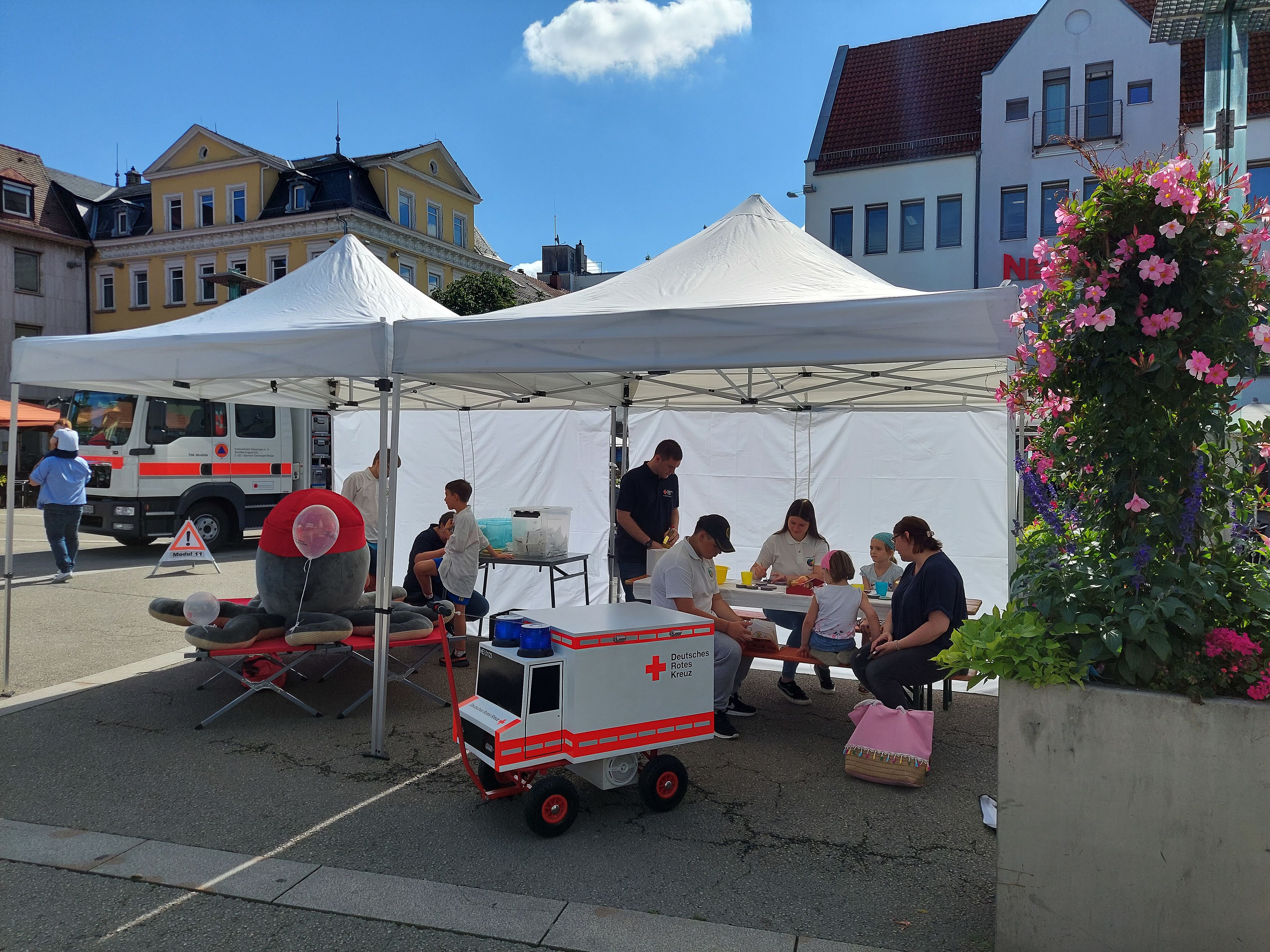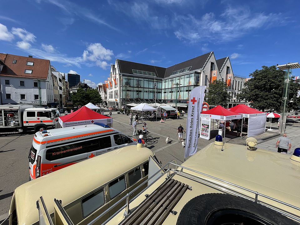 Auf dem Marktplatz in Göppingen ist an diesem Samstag Ende Juni richtig was los. Der Kreisverband Göppingen des Roten Kreuzes belebt das Stadtzentrum zwischen 10 und 15 Uhr mit einem Aktionstag zur Feier seines 75. Bestehens. „Wir zeigen das komplette Angebot dessen, was das Rote Kreuz mit seinen Haupt- und Ehrenamtlichen den Menschen im Landkreis bietet“, erklärt Bettina Merten, Hauptorganisatorin der Veranstaltung und Abteilungsleiterin Rotkreuz-Dienste. Außerdem ergänzen die Alb-Fils-Kliniken (AFK) den Aktionstag. „Wir kooperieren seit vielen Jahren miteinander und weil wegen der Baustelle der neuen Klinik unser gemeinsames Kinderfest nicht stattfinden kann, präsentieren wir uns gemeinsam hier“, erläutert Merten.
