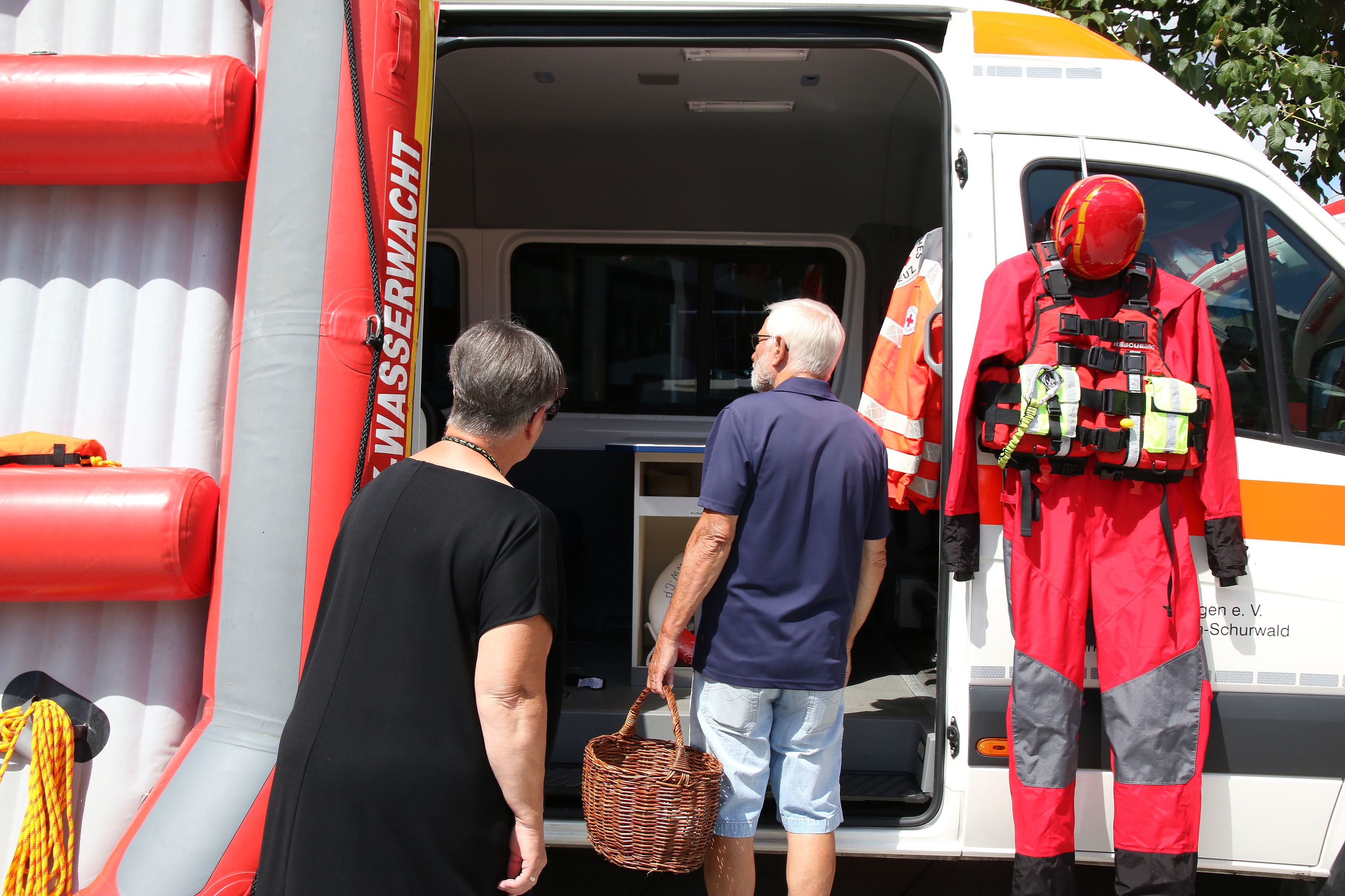 Am Stand der Wasserwacht erzählt Sven Hoffmann auf Nachfrage, dass die Wasserwacht im Landkreis vor allem bei Einsätzen in der Fils tätig wird sowie die Mitglieder der Feuerwehr und des Technischen Hilfswerks bei deren Einsätzen während Überschwemmungen unterstützt.