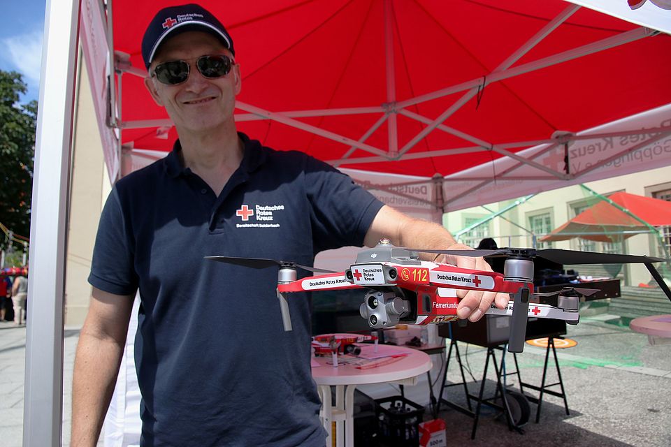 Einen relativ neuen Bereich der umfassenden DRK-Hilfen besetzt der Ortsverein Unteres Filstal-Schlierbach mit seiner Drohnengruppe. Wie vielseitig deren Einsatzgebiete sind, macht Michael Kläne auf Nachfrage deutlich: Lagebilder von Unfallstellen für die Feuerwehr erstellen, Glutnester aufspüren, Kitze retten oder Hilfsbedürftige finden mit der Wärmekamera an den Drohnen, Hilfsbedürftige in Gebäuden, Silos oder sogar in der Kanalisation finden und vieles mehr. Jugendliche wie Marcel finden das Fliegenlassen von Drohnen innerhalb eines Sicherheitsnetzes auf dem Marktplatz „richtig cool“.