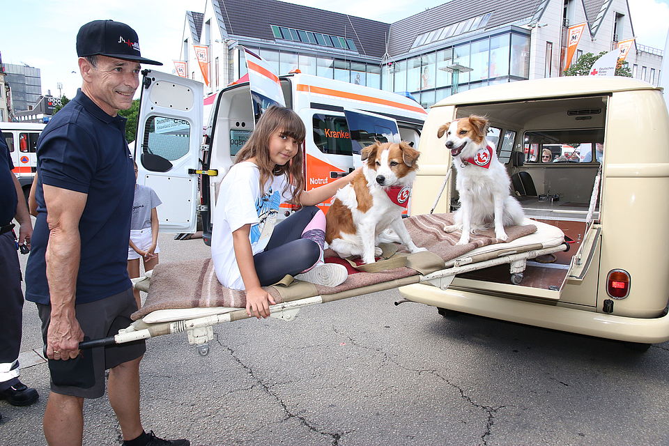 Was präsentiert wird, ist viel – und es ist spannend, lustig und informativ gleichzeitig. Einen Anziehungspunkt bildet etwa der alte Krankentransportwagen (KTW) VW T1 aus dem Jahr 1960 aus dem Fundus des Rotkreuz-Landesmuseums Baden-Württemberg in Geislingen. Der steht – für den direkten Vergleich – neben einem KTW der neuen Generation. „Vor allem Kinder lassen sich davon in ihren Bann ziehen“, erklärt Rainer Kienzle. Unter ihnen ist die elfjährige Viktoria, die sich nicht zweimal bitten lässt, um als „Patientin“ zu modeln. Schnell wird deutlich, wie aufwändig der Krankentransport damals war und wie einfach er für die Retter dank Automatisierung heute ist. Eine lachende Menschentraube bildet sich um die Rotkreuzler, als sich die beiden Kromfohrländer-Therapiehunde Anila und Ronja dank Zuredens ihrer Halterin Eva-Maria Matheas zu Viktoria auf die Trage gesellen. Entspannt lassen sie sich von Museumsleiter Jens Currle und seinem Kollegen Antonino Amato vom Boden nach oben heben und ins Auto schieben.