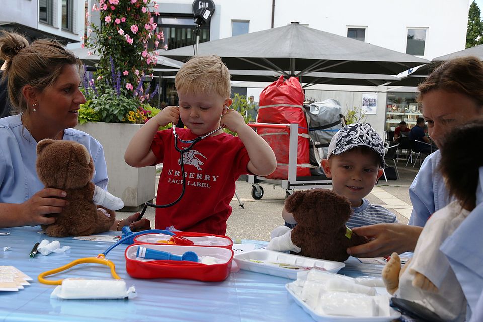 Wenige Meter davon entfernt haben die Mitarbeiter des SPZ (Sozialpädiatrisches Zentrum) und der Kinderklinik der AFK sowie der Klinikschule mit einem richtigen Andrang an Kindern zu kämpfen. Sie dürfen Teddybären der Teddybären-Klinik mit einem Stethoskop abhorchen, Nagelbilder basteln oder Stofftaschen mit Moosgummistempeln bedrucken.