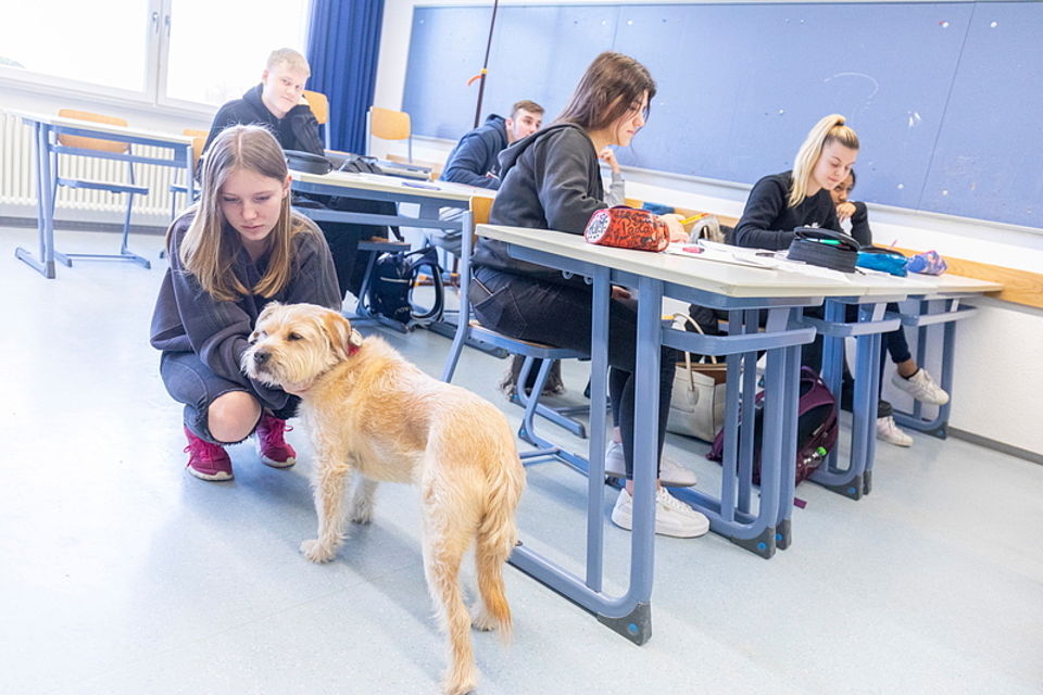 Lara aus der 9d bestätigt das: „Er erschrickt und zuckt zusammen bei plötzlichen Geräuschen und das wollen wir nicht. Deshalb sind wir leiser.“ Auch ihr Klassenkamerad Christian hat, wie er sagt, Linus’ Anwesenheit immer im Hinterkopf, auch wenn der Hund nicht sicht- oder hörbar ist. „Der Hund ist ausgesprochen diszipliniert“, betont der Neuntklässler.