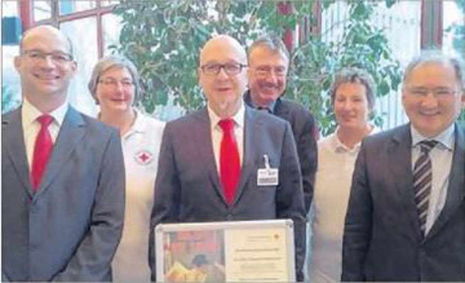 Die Vertreter des Ortsvereins, der Vorsitzende Axel Ost, sein Stellvertreter Ulrich Kienzle sowie die Kreisbereitschafts-leiterinnen Ulla Rapp und Claudia Hopf nahmen die Anerkennungsurkunde in Gegenwart von DRK-Kreis-verbandspräsident Peter Hofelich entgegen. Michael Kraus vom Blutspendedienst überreichte die Anerken-nungsurkunde für die erfolg-reiche Veranstaltung von 102 Blutspendeaktionen mit 28.574 Spenden seit März 1964.
