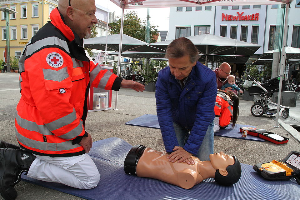 „Prüfen, rufen, drücken – dieses Prinzip wollen wir den Passanten vermitteln und ihnen die Angst nehmen, etwas falsch zu machen“, erklärt Ulrich Kienzle, stellvertretender Vorsitzender des Ortsvereins Göppingen-Schurwald im DRK-Kreisverband Göppingen. „Wenn jemand einen Herz-Kreislauf-Stillstand hat ist es ganz wichtig mit der Rettungskette zu beginnen, bevor der Rettungsdienst eintrifft“, fügt Axel Ost, Vorsitzender des Ortsvereins Göppingen-Schurwald hinzu.