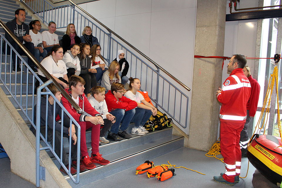 Nachdem Stefan Witzani, der Leiter des Jugendrotkreuzes im Landkreis, über verschiedene Regularien informiert hatte, übten sich die Schulsanitäterinnen und Schulsanitäter an insgesamt sechs Stationen. Konzentriert hörten die Schülerinnen und Schüler der Daniel-Straub-Schule Geislingen und des Schulverbundes Süßen, der Göppinger Pestalozzi-Schule und der Hermann-Hesse-Realschule Göppingen, der Grund- und Hauptschule Schlierbach und der Schubart-Realschule Geislingen, der Waldorfschule Faurndau und des Geislinger Helfenstein-Gymnasiums mit ihren Lehrkräften Sven Hofmann von der DRK-Wasserwacht zu. „Unser Szenario ist ein ins Wasser gestürztes Auto“, erklärte er seinen aufmerksamen Zuhörern. Und wollte zunächst wissen: „Wer kann schwimmen? Und wer kann sich nur über Wasser halten?“ Und informierte gleich: „Wir bilden im Schwimmen aus“. Dann führte er die einzelnen Schritte vor, bis die Menschen aus dem sinkenden Auto gerettet waren.