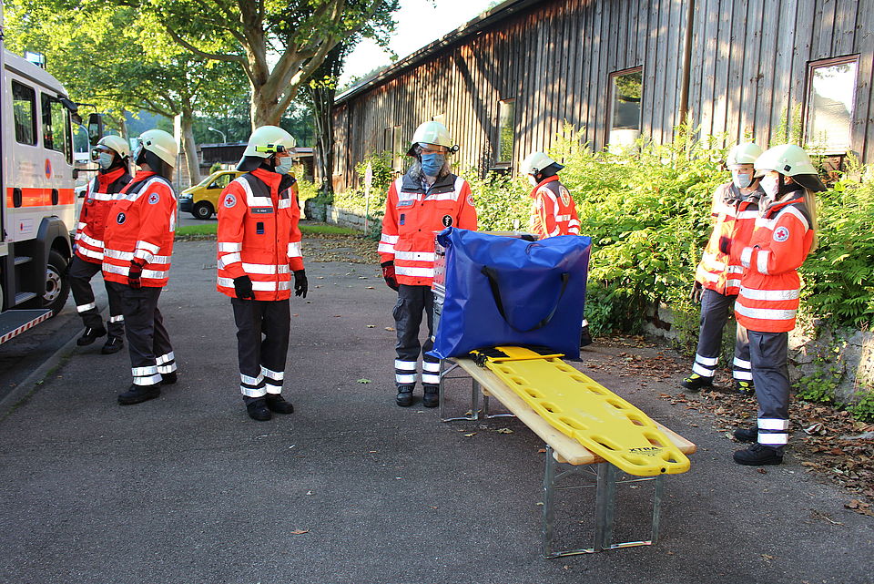 Die erste Gruppe hat einen Zettel mit Fragen gezogen und findet im Fahrzeug schnell die geforderten Materialien und Hilfsmittel. Niclas Rösch erklärt die einzelnen Ausrüstungsgegenstände und erhält Unterstützung von Jens Currle. Er weiß um die Einsatzmöglichkeit von zusätzlichen Tragegurten. „Sie sind für DIN-Tragen. Deren Gewicht verlagert sich dann auf die Schultern weg von den Armen.“ Der erfahrene Rotkreuzler weiß aber auch, dass sie „kompliziert anzulegen und eher unpraktisch sind“.