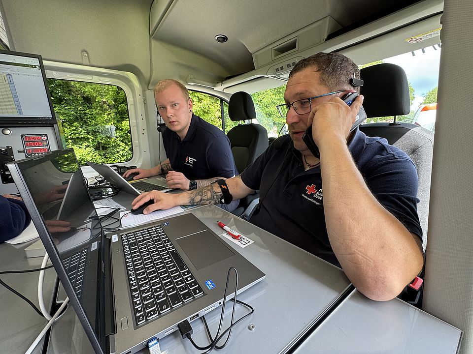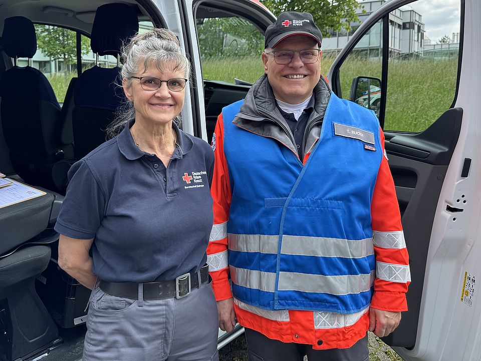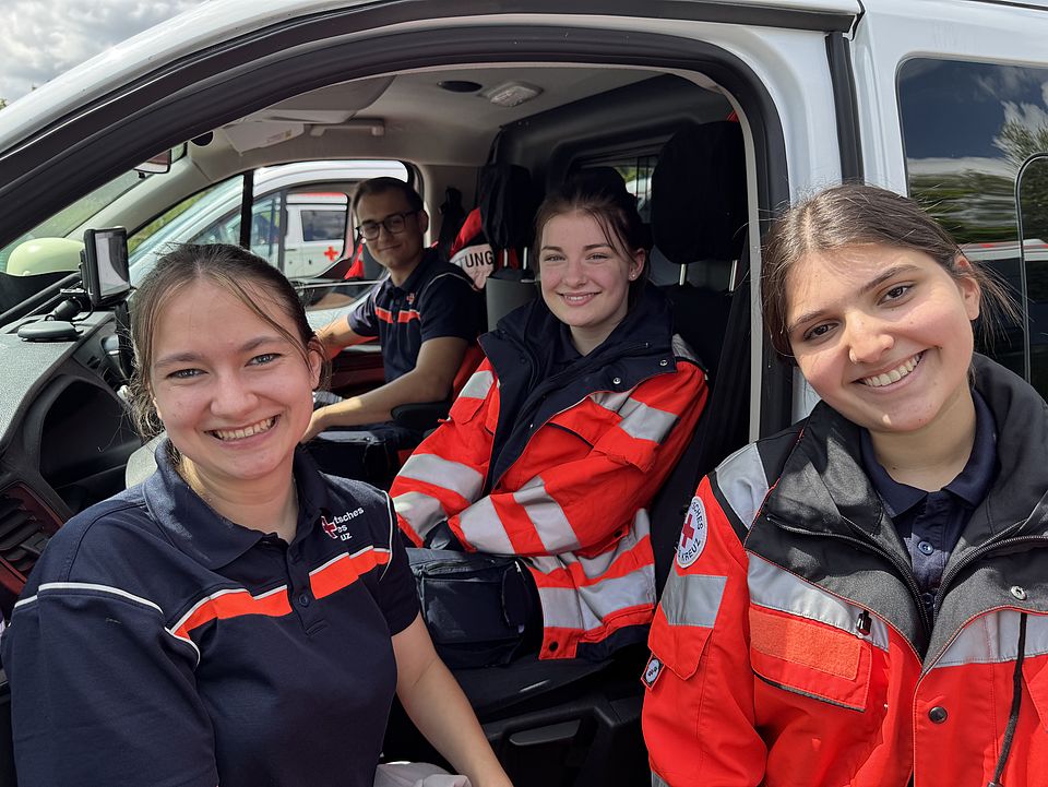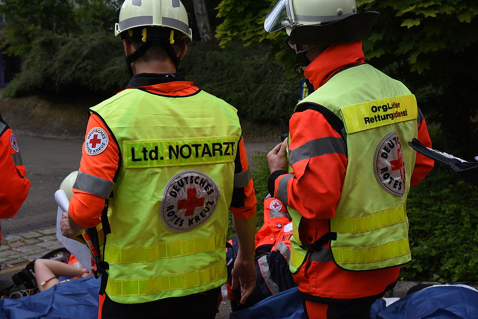 Göppingen, 17. Mai, Schulzentrum an der Öde: DRK-Rettungswagen rasen dutzendweise die Christian-Grüninger-Straße hinauf, die Feuerwehr auch. Was ist passiert? Edgar Wolff hat angerufen. Nicht als Landrat, als „Lehrer“. So wollte es das Drehbuch für die „MANV-Übung“, die das DRK und alle anderen Rettungsorganisationen im Landkreis und das Alb-Fils-Klinikum den ganzen Tag auf Trab hielt. „MANV“, das heißt im Amtsdeutsch „Massenanfall von Verletzten“, und der Umgang mit so einem Szenario will gelernt sein. „GoepEx2025“ hieß die Übung und für den Anfang stand im Drehbuch, das ein „Lehrer“ des Schulzentrums aufgeregt den Notruf wählt und kurz erklärt, was passiert ist: Beim Aufbau eines Licht- und Tongerüsts in der Turnhalle ist das Gerüst eingestürzt, es gibt viele Verletzte, „ich schätze so 50“, sagt Wolff, „davon vielleicht 10 Schwerverletzte“, sagt er auf Nachfrage aus der Leitstelle. Wenn die solche Zahlen hört, gibt es einiges zu tun. Und einen Plan, den „Alarm- und Einsatzplan zur Bewältigung eines Massenanfalls von Verletzten und Erkrankten im Landkreis Göppingen“. Die aktuelle Version wurde im Mai geübt. Und wie: die Leitstelle alarmiert praktisch alle Einheiten des Katastrophenschutzes im Landkreis: Deutsches Rotes Kreuz, Malteser-Hilfsdienst, Johanniter-Unfallhilfe, das technische Hilfswerk und natürlich die Feuerwehr. Die ersten Helfer*innen sind mit dem DRK-Notarzteinsatzfahrzeug ein paar Minuten nach dem Anruf von „Lehrer“ Wolff vor Ort.