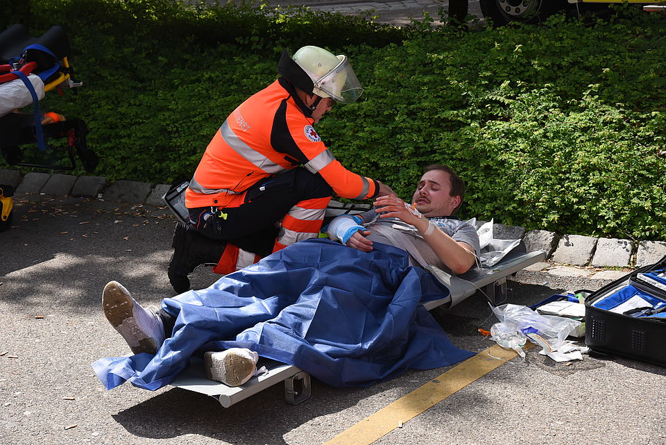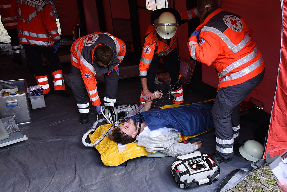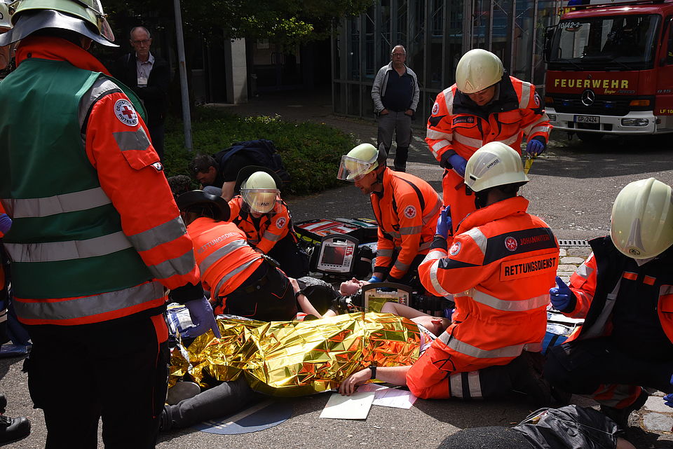 Was sie vor Ort erwartet, nimmt alle mit, auch die, die nur zugucken. Schon vor dem Eingang zur Turnhalle sitzt ein Verletzter und keucht apathisch. Im Foyer liegen mehrere Verletzte, im Flur dahinter auch, viele jammern und schreien, manche geben keinen Ton von sich. Sie haben es nach einer Massenpanik in der Turnhalle irgendwie noch aus der Halle geschafft, sind aber zum Teil übel zugerichtet. In der Halle dann ein Bild des Grauens: Unter und vor den Gerüsttrümmern überall Verletzte, eine Frau mit großer Scherbe im Hals, ein Mann mit einem Stahlrohr im Oberschenkel, ein anderer hat ein Stück Stahl im Bauch. Überall Erbrochenes, verzweifelte Schreie nach Hilfe. Das Schminkteam und die Schauspieltruppe legen filmreife Arbeit aufs Turnhallenparkett. Der Notarzt und die ersten eingetroffenen Notfallsanitäter*innen gehen zu den Verletzten, es ist die erste Sichtung: wer ist wie schwer verletzt? Wer braucht sofort Hilfe? Wer kann noch warten? Dem Verletzten mit dem Rohr im Oberschenkel wird schnell das Bein abgebunden, dann weiter geschaut, alles jammert, wimmert, schreit.