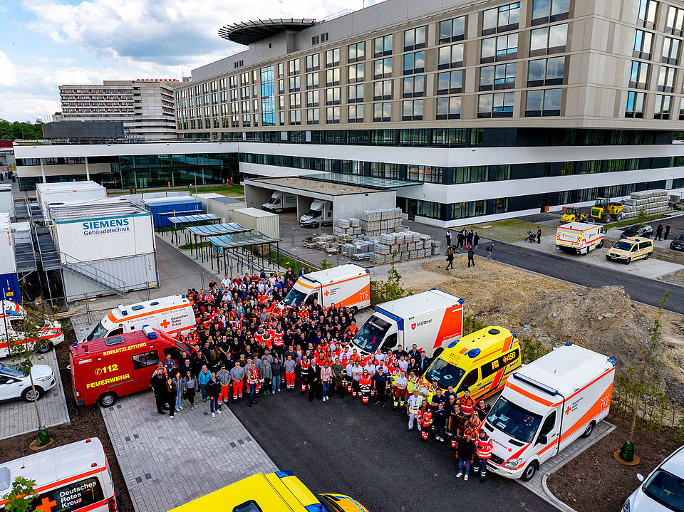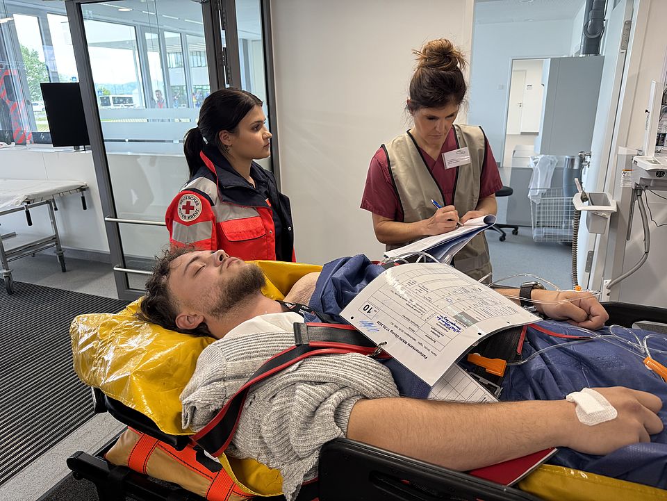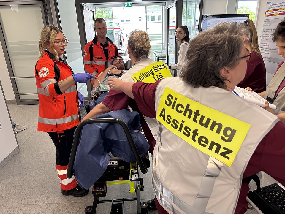 Oben in der Klinik angekommen kommen die Verletzten in die Notaufnahme, die schweren Fälle in die drei Schockräume, die Leichtverletzten gehen ins Foyer, dort werden sie versorgt und können die Klinik verlassen. Hier wartet auch Klinikseelsorger Achim Esslinger, er kümmert sich im Ernstfall vor allem um die Angehörigen der Opfer, für die es am Samstag auch Schauspieler gibt, vor der Notaufnahme spielen sich dramatische Szenen ab, das Sicherheitspersonal muss am Ende einige „verzweifelte“ Angehörige zurückdrängen. Auch die Unfallnachsorge des DRK, die Teil der psychosozialen Notfallversorgung ist, ist vor Ort.