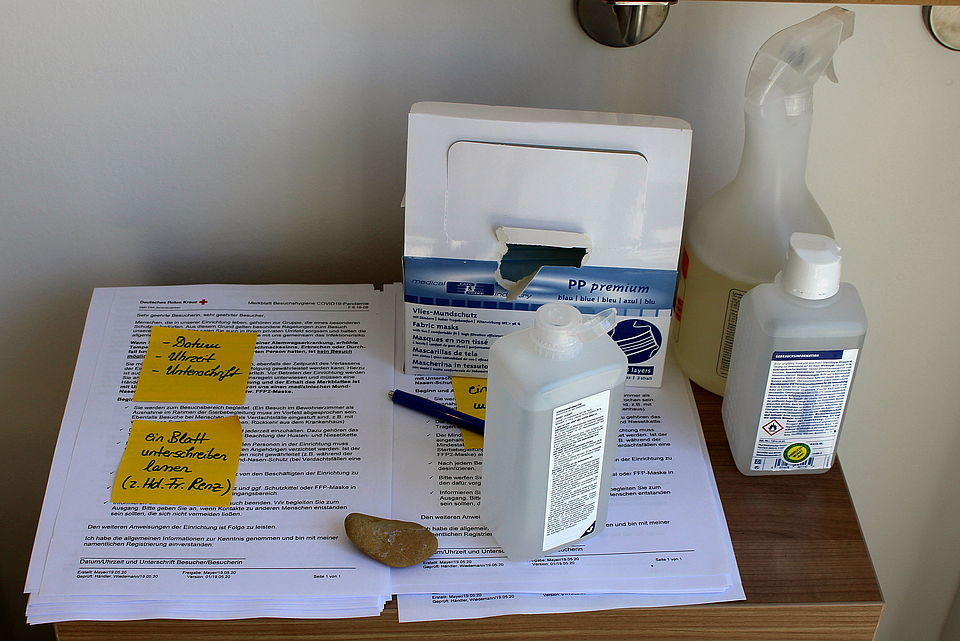 Nach der Händedesinfektion – im Eingangsbereich der Einrichtungen stehen die entsprechenden Mittel bereit – müssen sie eine Maske aufsetzen und werden von Mitarbeitenden in eigens ausgewiesene Besuchsbereiche – bei schönem Wetter in den Garten – geführt.