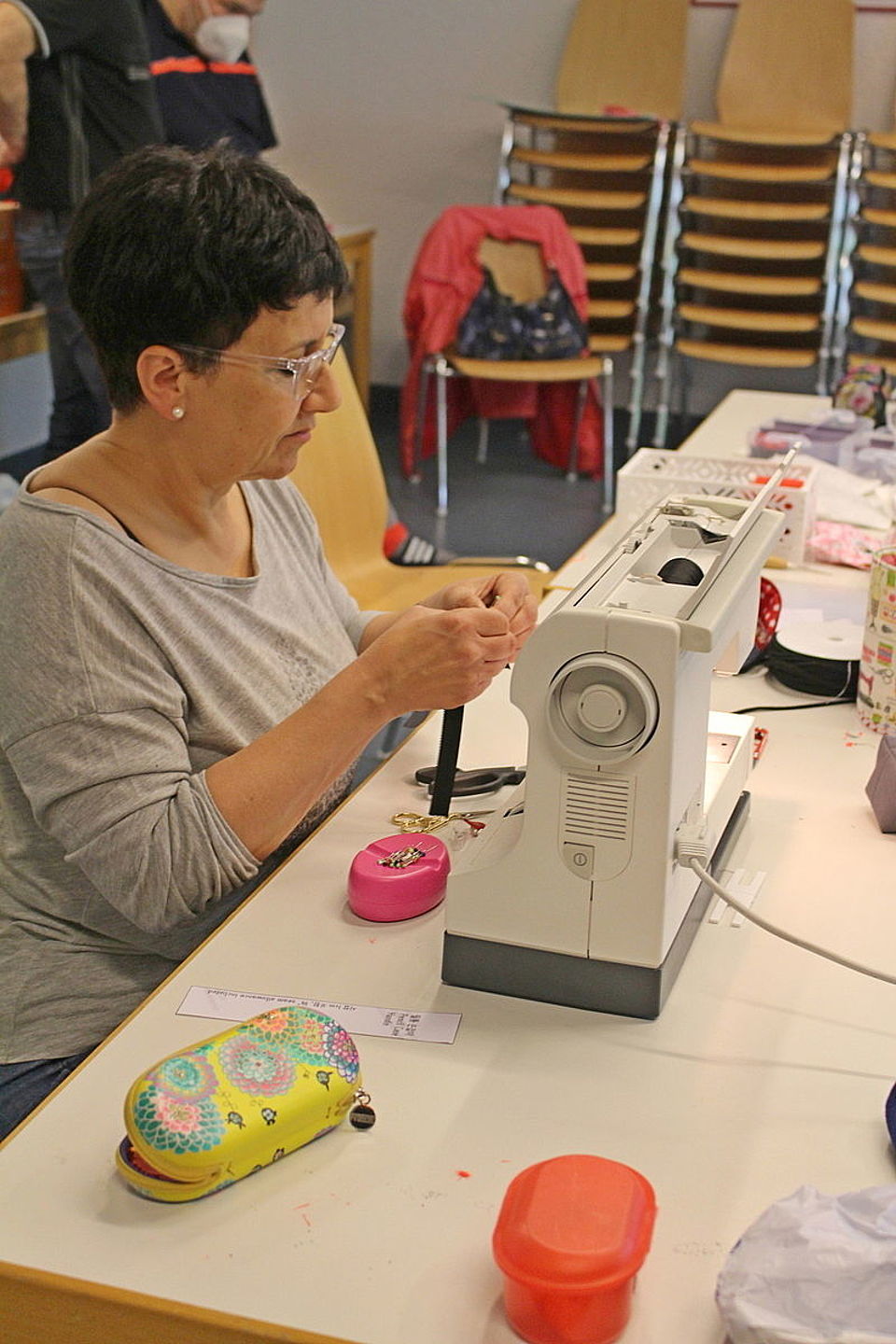 Keine der Rotkreuzlerinnen ist gelernte Schneiderin. „Ich hatte von meinen Kindern eine Nähmaschine geschenkt bekommen, weil ich zu Beginn der Corona-Pandemie auch Masken nähen wollte. Wir lernen voneinander und unterstützen uns gegenseitig“, sagt Stefanie Grothe.