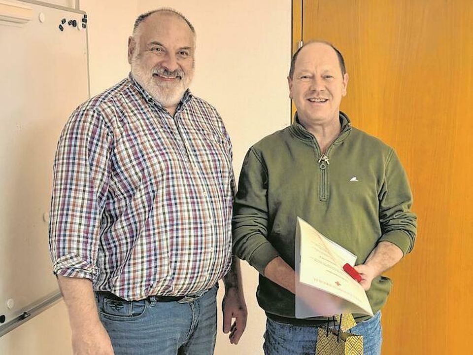 Drackenstein. Rainer Daubenschüz (im Bild rechts) hat 25 Mal Blut gespendet. Vor Kurzem hat Daubenschüz deswegen die DRK-Blutspender-Ehrennadel in Gold erhalten. Diese überreichte ihm der Drackensteiner Bürgermeister Roland Lang im Rahmen der Gemeinderatssitzung. Lang verwies in diesem Zusammenhang darauf, dass jährlich 7500 Liter Blut für medizinische Behandlungen benötigt werden, der Blutvorrat in Deutschland sich jedoch auf kritischem Niveau befände. Das gilt auch für den Kreis Göppingen (wir berichteten).