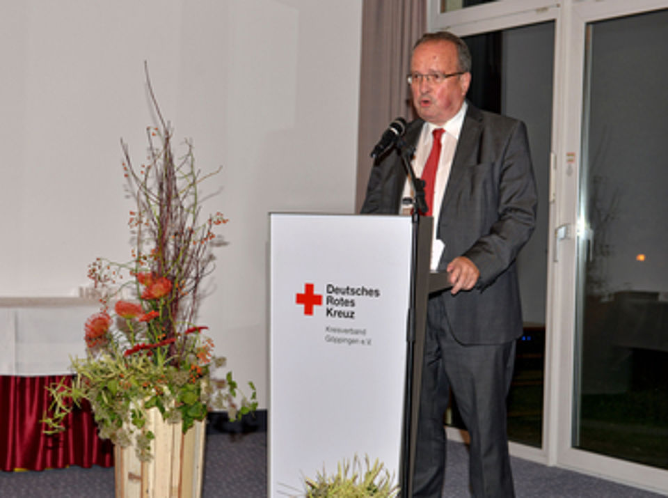Dr. Eberhard Schwerdtner, Vizepräsident des DRK-Landesverbandes Baden-Württemberg e.V. übernahm im Anschluss die besonderen Ehrungen. Doch zuerst schwenkte auch er zur aktuellen Flüchtlingssituation. Er erzählte von der aktuellen Herausforderung, in Ellwangen eine Halle für Flüchtlinge herzurichten und fragte ins Publikum: „Wenn nicht wir, wer dann?“ Er lobte dabei die Stärke des DRK und vor allem das starke Ehrenamt, das an solch einem Abend besonders geehrt wird.