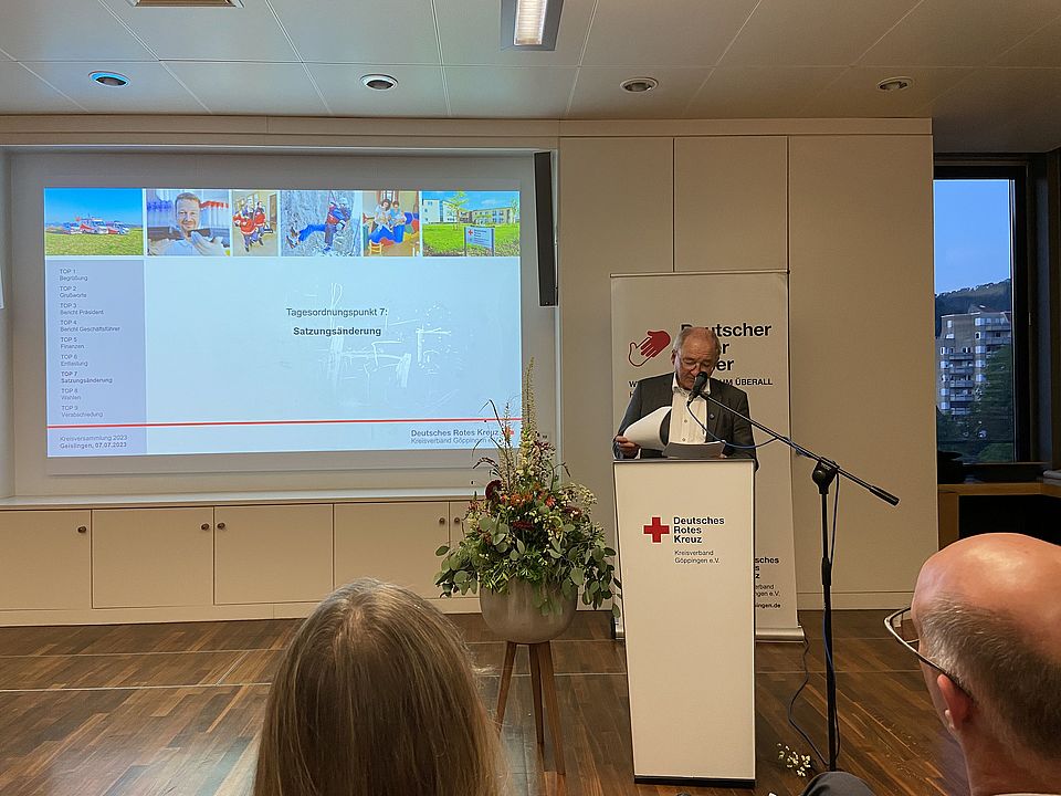 Nachdem die Jahresversammlung des DRK-Kreisverbandes in den letzten Jahren wegen der Corona-Pandemie in der Göppinger Stadthalle stattfand, konnte Kreisverbandspräsident Peter Hofelich die Mitglieder und Gäste in diesem Jahr wieder im Saal der Kreissparkasse in Geislingen begrüßen. „Heute werfen wir den Blick zurück auf ein besonderes Jahr, in dem der Kreisverband sein 75-jähriges Jubiläums gefiert hat, aber auch den Blick nach vorn“, betonte Peter Hofelich.
