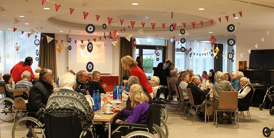 Die Senior*innen, auch die Bewohner*innen vom benachbarten betreuten Wohnen, machen sich nämlich gedanklich auf die Reise, in eben die lichtdurchflutete Türkei. „Einmal im Jahr laden wir zu so einem Nachmittag ein. Wir reisen jedes Mal in ein anderes Land und unser Team kocht und backt dann extra landestypische Spezialitäten“, freut sich Nora Rauschenberger, Pflegedienstleiterin des DRK-Seniorenzentrums. Nach einer virtuellen Reise nach Kroatien und Griechenland ging es jetzt eben an den Bosporus. „Genießen Sie die Zeit und lassen Sie sich verwöhnen“, begrüßte sie die „Reisenden“, die sich an liebevoll gedeckten Tischen im aufwändig dekorierten Foyer, in dem sogar eine Shisha-Ecke eingerichtet ist, leckeres, vom Team selbstgebackenes Baklava schmecken lassen und zur lebensfrohen orientalischen Musik gar ein Tänzchen wagen.