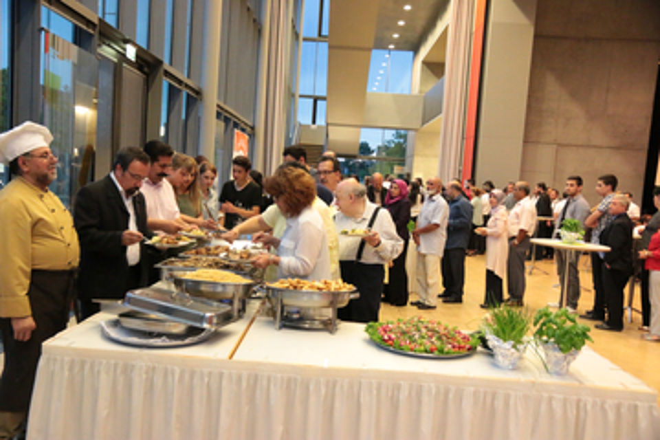 Es ist Freitagabend, kurz vor halb zehn. Essensdüfte, die das Wasser im Mund zusammenlaufen lassen, ziehen durchs Uhinger Uditorium. Über 300 Menschen haben sich hier zum gemeinsamen Fastenbrechen versammelt, sowohl Christen als auch Muslime. Für Muslime ist der Ramadan – der Fastenmonat – heilig. Er ist einer der fünf Säulen des Islam. Das allabendliche Fastenbrechen (Iftar) gerät zum Fest, entweder im kleinen Kreis der Familie oder im großen Kreis mit Nachbarn und Freunden. Wie in Uhingen, wo sich die Deutsch-Türkische Gesellschaft (DTG) e.V. aus Stuttgart, die VTV (Vereinigung Türkischer Vereine im Landkreis Göppingen e.V.) und das Deutsche Rote Kreuz Kreisverband Göppingen zum dritten Mal seit 2013 zusammengetan haben, um diese Veranstaltung gemeinsam zu begehen. Es geht ihnen ums gegenseitige Kennenlernen, Verstehen, Respektieren, Wertschätzen. Deshalb lautet das Motto des Abends "Kennenlernen und einander verstehen".
