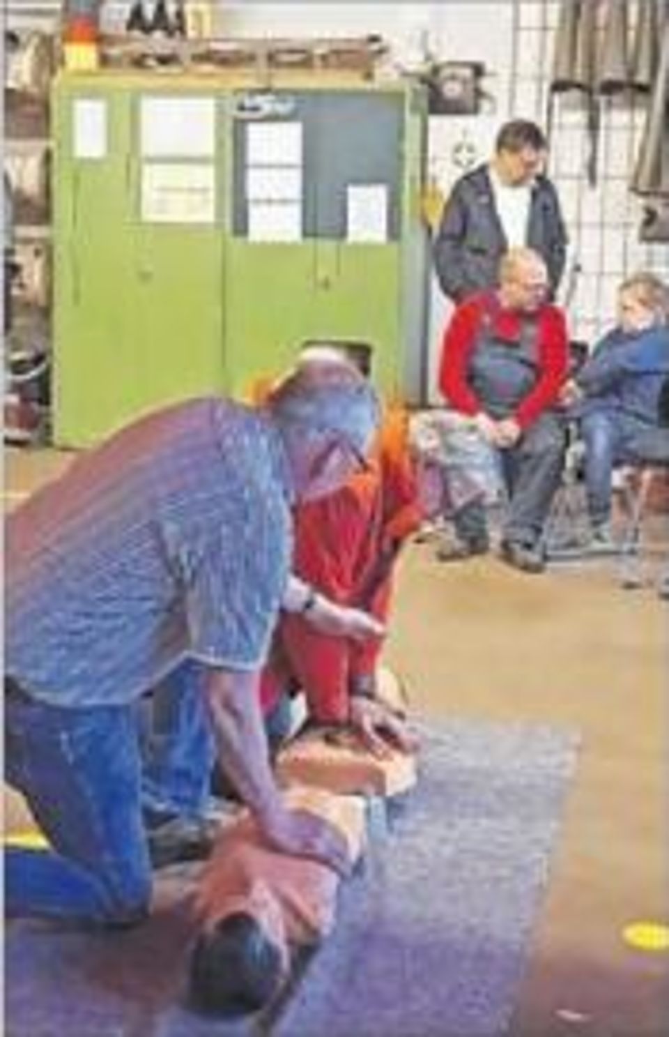 Eybach - Funk wies in der Einleitung zu seinem Kurs darauf hin, dass jeder, der eine reglose Person auffindet, dazu verpflichtet ist, nach bestem Wissen unverzüglich mit lebensrettenden Sofortmaßnahmen zu beginnen. Um einen Kreislaufstillstand zu erkennen, müssen die Ersthelfer die Vitalfunktionen Bewusstsein und Atmung des Patienten überprüfen. Funk zeigte, wie bei Bewusstlosigkeit und vorhandener Atmung die stabile Seitenlage angewendet wird. Ziel dieser Maßnahme ist es, zu verhindern, dass der Betroffene an Erbrochenem oder Blut erstickt, weil es nicht durch den Mund abfließen kann, Letzterer ist bei dieser Form der Lagerung der tiefste Punkt des Körpers.
