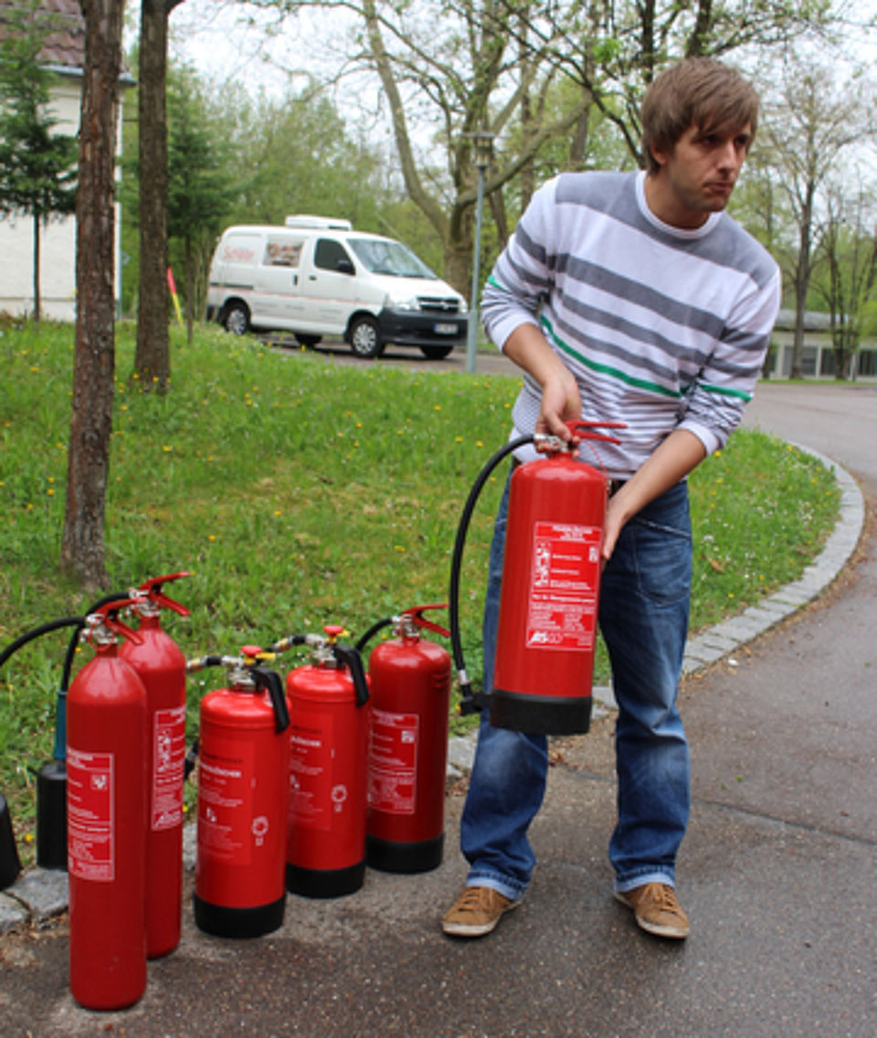 Benedikt Stehle, Brandschutzbeauftragter beim berufsgenossenschaftlich-arbeitsmedizinischen und sicherheitstechnischen Dienst Ulm, demonstrierte augenscheinlich die richtige Handhabung eines Feuerlöschers, will so Ängste abbauen und zeigte zunächst eindrucksvoll, wie sich eine Deo- oder Haarspraydose bei großer Hitze verhält. Mit einem lauten Knall explodierte sie, die Flammen schlugen meterhoch aus dem schützenden Eisenkäfig heraus. Der Sicherheitsexperte warnte vor unsachgemäßem Umgang mit elektrischen Geräten und Zubehör. „Ein Verlängerungskabel eingesteckt ins Verlängerungskabel, das geht gar nicht.“ Auch übermäßig beanspruchte Mehrfachsteckdosen lösen immer wieder Brände aus. Nachdem er die unterschiedlichen Feuerlöscher erklärt hat, probieren die ersten Freiwilligen, ein Feuer zu löschen. Kai-Uwe Eisenhut von der Bereitschaft Wiesensteig ist – was das Feuerlöschen anbelangt – familiär vorbelastet. „Halten Sie den Schlauch fest, bevor Sie den Feuerlöscher auslösen und achten Sie auf die Windrichtung“, erklärt ihm Benedikt Stehle. Und: „Löschen Sie direkt an der Feuerquelle.“ Die Teilnehmer der Gruppe probieren die verschiedenen Feuerlöscher aus, die je nach Zündstoff unterschiedlich befüllt sind, und sind sich einig, dass es sehr hilfreich war, einmal mit dem Feuerlöscher geübt zu haben.