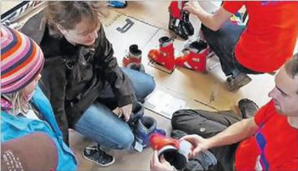 Bereits eine halbe Stunde vor dem Start standen zahlreiche Leute vor den Türen der DRK-Fahrzeughalle unweit der Klinik am Eichert Schlange, berichtet Dominik Abele. Und der Pressesprecher der Bergwacht weiß aus Erfahrung: „Am schnellsten vergriffen sind immer die Kinderski. In der ersten Stunde machen wir die Hälfte vom Umsatz.“ Mit 35 Kollegen, darunter sieben Mädels, organisiert, betreut und begleitet er wie alle Bergretter gleichfalls ehrenamtlich Auf- und Abbau sowie den Verkauf. „Das ist inzwischen Tradition. Nur der frühe Vogel fängt den Wurm, vor allem die guten Sachen für Kinder sind schnell vergriffen“, unterstreicht Uwe Poller, der für den Skibasar gemeinsam mit seiner Frau Eva und seinen zwei Jungs stets „frühzeitig aus den Puschen kommt“. Was Beratung anbetrifft, da haben die freundlichen Helfer jede Menge zu tun. „Du Dominik, der Herr interessiert sich für diesen Schuh, sagt dir die Marke Dalbello was“, will ein Kollege wissen. Ein prüfender Blick auf den Skistiefel und die Antwort folgt sofort. Eine gute Wahl, denn Dalbello zähle zu den italienischen Topmarken: „Mit einem Härtegrad oder Flexwert von 120 ist der Skistiefel für sportliche Läufer geeignet und passt sich durch seine Veränderungsmöglichkeiten vielen Fußformen an“, kennt sich Dominik Abele in der Materie aus.