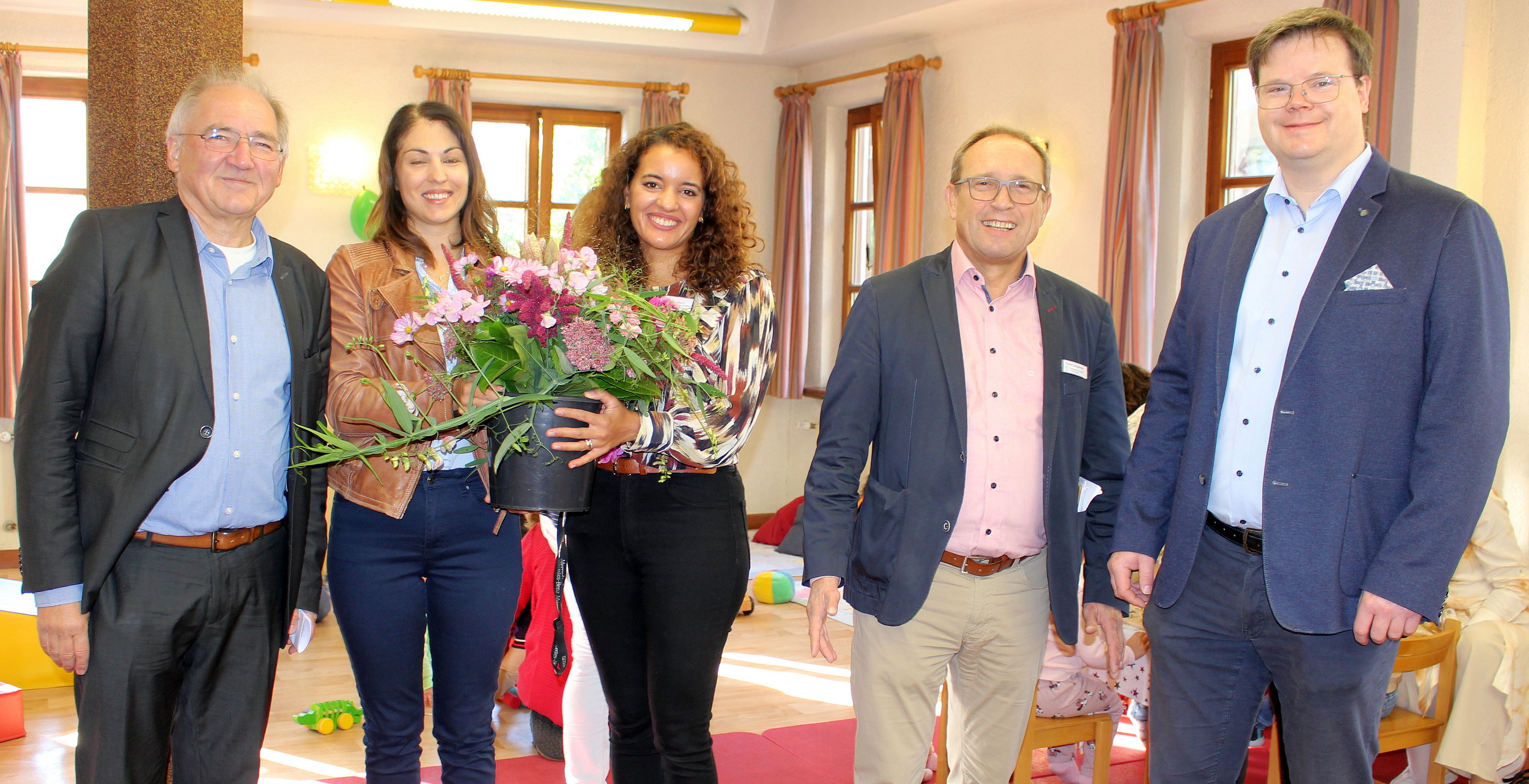 Es war zunächst ein Pilotprojekt, das Landkreis, Stadt und das Rote Kreuz vor 16 Jahren starteten, das sich aber schnell zum Erfolgsmodell entwickelte und „zwischenzeitlich in zwölf Kreiskommunen großen Zuspruch findet“, freute sich der Sozialdezernent des Landkreises, Rudolph Dangelmayr. Er betonte in einer kleinen Feierstunde, die pandemiebedingt ein Jahr verschoben werden musste, dass das Konzept des niedrigschwelligen Angebotes für Familien mit kleinen Kindern auf breite politische Unterstützung treffe. „Familien erhalten hier breite Unterstützung“. Und dies auch während des Lockdowns. „Ich war beeindruckt von den kreativen Alternativen, mit denen Sie weiter Angebote für die Familien schufen“, bedankte er sich bei Sonia Khalfaoui-Achour, die den Treff leitet. Sie könne auch präventiv wirken. Denn: „Durch das vertrauensvolle Miteinander öffnen sich nicht selten Wege für weitere professionelle Hilfen.“ Als kleines Präsent hatte er einen Murmelklangbaum mitgebracht.