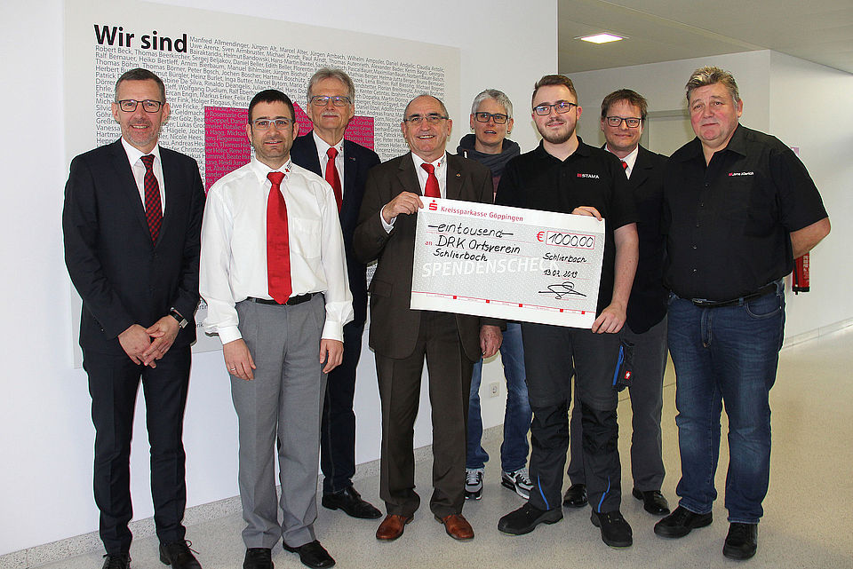 Zur Übergabe des Spendenschecks waren STAMA-Geschäftsführer Crispin Taylor, Betriebsrätin und Gesundheitskreismitglied Susanne Weigele, der Betriebsratsvorsitzender Jens Klarich, Ralf Zwölfer, Vorstandsmitglied im DRK-Ortsverein und Mitarbeiter bei STAMA, Markus Ehrle, Organisator der Aktion, sowie Reiner Kurz Vorsitzender des DRK-Ortsvereins Unteres Filstal-Schlierbach, sein Stellvertreter Paul Schmid und Bereitschaftsleiter Torsten Seipel gekommen.