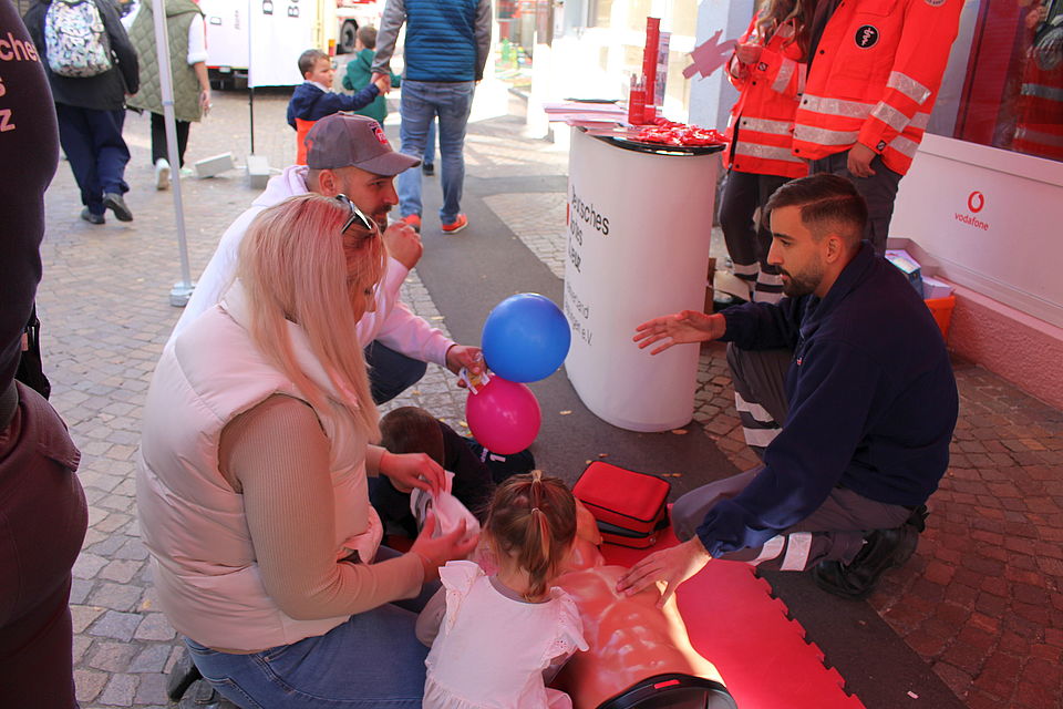 Wenige Meter weiter steht Jens Currle Rede und Antwort. Zwei Männer sind interessiert an der Ausrüstung des „Gerätewagen Logistik“, lassen sich die vielen Details eingehend erläutern. Auch DRK-Kreisbereitschaftsleiter Raimund Matosic ist in die Geislinger Innenstadt gekommen. „In dieser Form präsentieren wir uns das erste Mal.“ Er freut sich: „Die Menschen nehmen uns wahr, unsere speziellen Dienste und Möglichkeiten.“ Sie lassen sich etwa die umfangreiche Ausstattung des „Gerätewagen Sanität“ erklären, der im Katastrophenfall zum Einsatz kommt. Bereitschaftsleiter Sebastian Grothe zeigt, wie einfach es sein kann, ein Menschenleben zu retten und demonstriert die Wiederbelebung. Acht Ehrenamtliche des Geislinger Ortsvereins sind vor Ort, werben an diesem schönen Oktobersonntag für ihr Engagement. Wie auch die Aktiven der Psychosozialen Notfallversorgung (PSNV), die gemeinsam mit den Notfallseelsorger*innen des Landkreises zunächst einmal erklären müssen, was sich hinter dem Begriff verbirgt. „Wir sind für Angehörige und Einsatzkräfte da, wenn sie durch traumatische Nachrichten oder Erlebnisse Begleitung und Unterstützung benötigen“, erklärt Alexander Schmidt. So waren etwa auch Engagierte der PSNV nach der Flutkatastrophe im Ahrtal und begleiteten die geschockten Menschen.