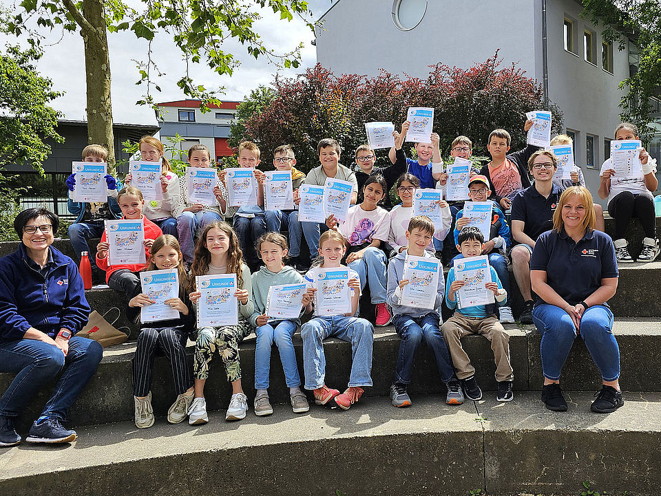 Die ausgebildete Rettungssanitäterin, die für den DRK Kreisverband Göppingen tätig ist und sich ehrenamtlich in der Bereitschaft Hattenhofen als stellvertretende Bereitschaftsleiterin und Helferin vor Ort engagiert, hat die Viertklässler der Hattenhofener Grundschule acht Stunden lang in Erster Hilfe unterrichtet. Heute stellen die Kinder in einem kleinen Parcour mit sechs Stationen unter Beweis, dass sie viel gelernt haben. Was tun bei Nasenbluten? Wie legt man einen Druckverband und einen Fingerkuppenverband an? Wie setzt man einen Notruf ab und was ist zu beachten? Vier Ehrenamtliche der DRK-Bereitschaft Hattenhofen und zwei Lehrerinnen sind an den Stationen mit im Einsatz und geben bei Bedarf kleine Hilfestellungen. Am Ende erhalten alle Kinder eine Urkunde und die 4. Klasse erhält vier Warnwesten und einen Erste-Hilfe-Rucksack. Alle haben die kleine Prüfung bestanden und können nun als „Schulsanitäter“ zum Einsatz kommen.