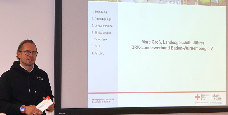 Erste Maßnahmen sind bereits umgesetzt, bis Ende 2026 sollen die Ergebnisse der Arbeitsgruppen des Strategieprozesses des DRK-Kreisverbandes Göppingen alle umgesetzt werden. Das bedeutet aber nicht das Ende eines Weges, den der DRK-Kreisverband seit Anfang 2024 mit zahlreichen haupt- und ehrenamtlichen Mitarbeitenden beschritten hat. „Strategie ist kein Thema, das endet. Es atmet“, stellte Marc Groß, Geschäftsführer des DRK-Landesverbandes Baden-Württemberg Anfang Oktober anlässlich der Präsentation des Strategieberichtes 2024/25 in der DRK-Kreisgeschäftsstelle Göppingen fest. Er erinnerte an den Prozess auf Landesebene, der vorausgegangen war, der „die DNA des Roten Kreuzes“ formuliert habe. Nämlich, dass das Rote Kreuz „stabil sozial“ sei, dass sich seine Angehörigen „zuverlässig für eine humanitäre Gesellschaft“ einsetzen, „für alle Menschen, die uns am nötigsten brauchen“. Der Strategieprozess sei „das verbindende Element zwischen den Ortsvereinen und Kreisverbänden und dem Landesverband. Und: „Das Strategiepapier gibt den Menschen im Landkreis Göppingen eine klare Orientierung.“