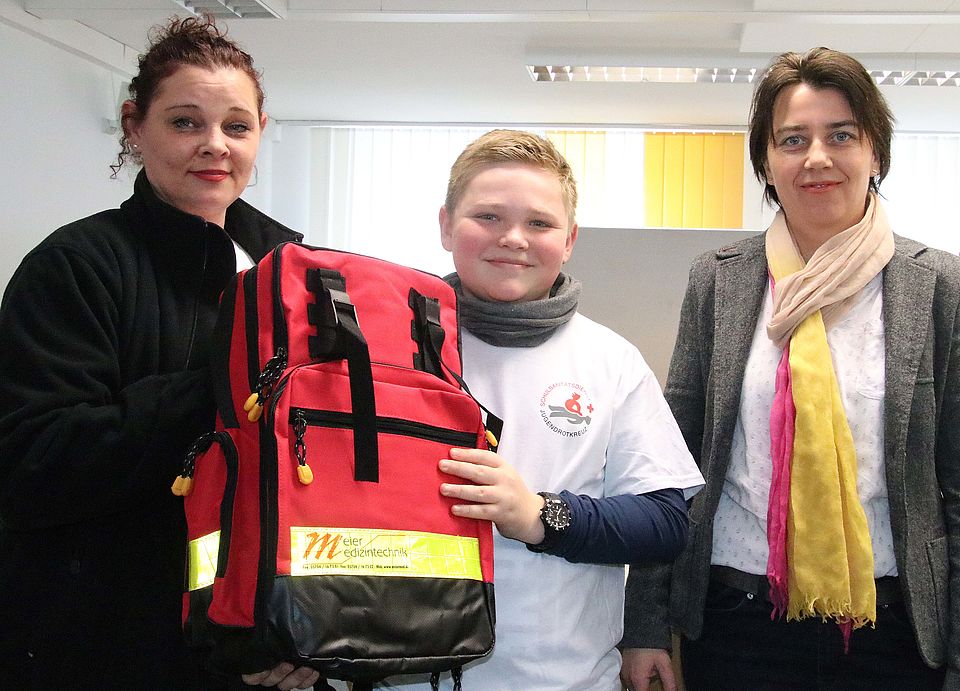 „Es ist mir eine Freude, heute den Schulsanitätsdienst mit Unterstützung des DRK einsetzen zu können“, betonte die stellvertretende DRK-Vorsitzende im Kreis, Heike Till. Ausdrücklich dankte sie den Schülern für ihre Bereitschaft, Verantwortung zu übernehmen. Heike Till hob auch das außerordentliche Engagement der Schule hervor. Es sei nicht selbstverständlich, dass so viel Zeit und Mühe seitens der Schulleitung und des Kollegiums in seine solches Projekt investiert werde. Die Mutter zweier Kinder berichtete, dass es das Schreckensszenario einer Mutter sei, dass sich ein Kind auf dem Schulhof oder beim Sport verletze. Es sei dann beruhigend zu wissen, dass jemand da ist, der wisse was im Notfall zu tun ist.