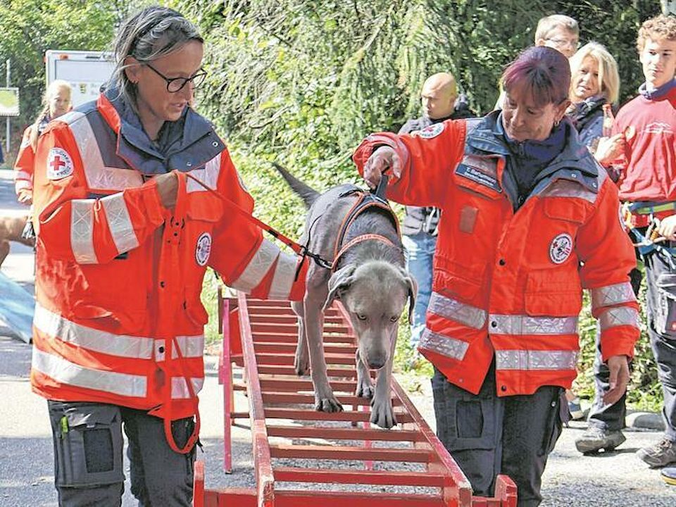 Hattenhofen - „Die Hunde!“ Zwei Jungs aus Albershausen sind sich einig: Was die Rettungshunde-Teams präsentiert haben, war einer der Höhepunkte des Tags der offenen Tür des DRK-Ortsvereines Hattenhofen-Voralb. Auch die Eltern sind begeistert: „Das ist ja toll, was hier alles gezeigt wird! Und wie vielfältig das DRK ist!“ Die Rotkreuzler hatten anlässlich ihres 70-jährigen Bestehens in ihr Gemeinschaftshaus an der Schützenstraße eingeladen und boten ihren zahlreichen Gästen gemeinsam mit den Partnern aus dem DRK-Kreisverband ein vielfältiges Programm. Hoch hinaus ging es etwa bei der DRK-Bergwacht. Ein Mädchen stellte zunächst den Rekord beim Kistenstapeln auf, erreichte beinahe die Dachkante. Mats Bachmann präsentierte gemeinsam mit dem Maskottchen, einem vielarmigen Oktopus, das Jugendrotkreuz. „Wir sind eine gute Gemeinschaft und lernen, mit einfachen Mitteln, erste Hilfe zu leisten.“ Bei verschiedenen Übungsszenarien stellten die Rotkreuzler eindrucksvoll ihre Professionalität unter Beweis. „Ich bin sehr froh, dass wir so ein gut aufgestelltes Rotes Kreuz in unserer Gemeinde haben mit Sanitätsbereitschaft und Schnelleinsatzgruppe, mit Helfern vor Ort und der Einsatzeinheit des Katastrophenschutzes und dem Jugendrotkreuz“, freute sich Bürgermeister Jochen Reutter, der dem Ortsverein, zu dem seit 2005 zahlreiche weitere Voralbgemeinden zählen, vorsteht.