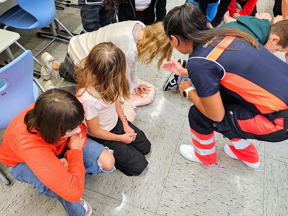 Bettina Steinbacher, ausgebildete Rettungssanitäterin beim DRK Kreisverband Göppingen und ehrenamtlich in der Bereitschaft Hattenhofen als stellvertretende Bereitschaftsleiterin aktiv, demonstriert den Jugendlichen, wie’s praktisch geht. „Oberkörper frei machen, Mitte des Brustkorbs suchen, eine Hand darauf und die andere darüberlegen und im Rhythmus drücken! Am besten auf den Knien, da hat man am meisten Kraft!“ Dann sind die Jugendlichen dran. Zum Rhythmus von „Pokerface“ wird kräftig gedrückt. „Wenn möglich, alle zwei Minuten mit jemand anderem wechseln“, erklärt Bettina Steinbacher, und nicht nur die Klasse 7b merkt bei der praktischen Übung ziemlich schnell, dass das Drücken anstrengend ist und die Handgelenke schmerzen.