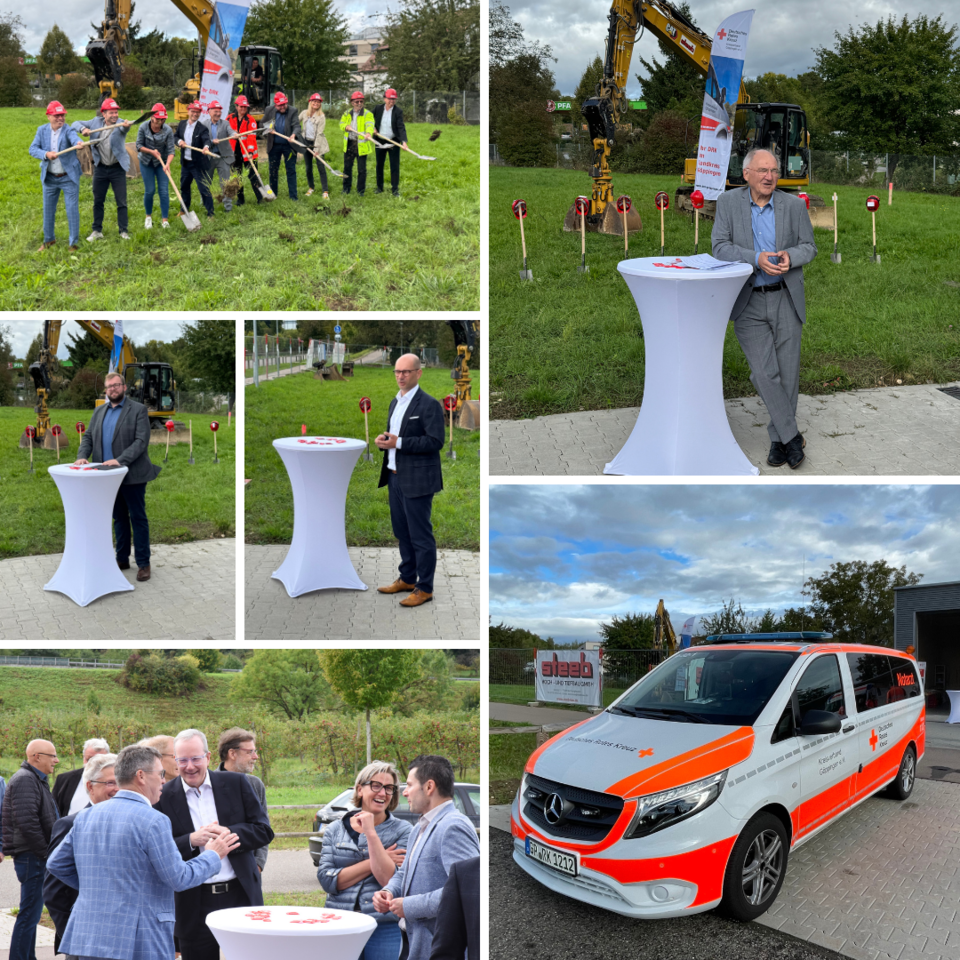 Der Göppinger Oberbürgermeister Alex Maier überbringt zum Spatenstich den Dank der Stadt: „Das Sie das Bauprojekt in Angriff nehmen, obwohl die Förderung vom Land noch aussteht, ist aller Ehren wert“, sagt er und spricht von „ganz, ganz großem Respekt“ und einem „starken Signal vom DRK“. Ronny Biehle, stellvertretender Geschäftsführer der AOK Neckar-Fils und Vorsitzender des Bereichsausschusses, spricht von einem „intelligenten Standort“ der neuen Wache. Die bekommt eine Grundfläche von knapp 240 Quadratmetern, darin ist Platz für zwei Dienstzimmer, zwei Ruheräume, Umkleiden, Duschen und WCs, einen Bereitschaftsraum und natürlich eine Fahrzeughalle für ein Notarzt-Einsatzfahrzeug. Dessen Besatzung stellt wie bisher das Alb-Fils-Klinikum, das für den Notarzt oder die Notärztin verantwortlich ist, und das DRK, das die Notfallsanitäter*innen stellt. Das 1100 Quadratmeter große Grundstück an der Christophsbad-Allee hat das DRK langfristig – für 45 Jahre – vom Christophsbad gepachtet. Auch das benachbarte Grundstück mit der provisorischen Wache gehört dem Christophsbad, die provisorische Wache - seit Dezember 2023 in Betrieb - wird nach dem Umzug abgebaut, das Garagentor der jetzigen Wache wird im Neubau übernommen.