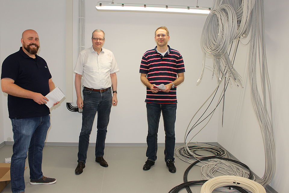 Ein dicker Kabelstrang mit ungezählten Kabeln hängt von der abgehängten Decke eines Raumes herunter. „Dies wird der Server-Raum, das Herzstück der ILS“, erläutert Andreas Bachmann. „Wir statten ihn doppelt aus – falls ein System ausfällt“. Sechs Server werden hier Platz finden. Der Raum ist in ehemaligen Büros der Göppinger Feuerwehr eingerichtet worden – wie auch das neue Büro von Leitstellenleiter Peter Welsch und das seines Stellvertreters, der von der Feuerwehr benannt werden wird.