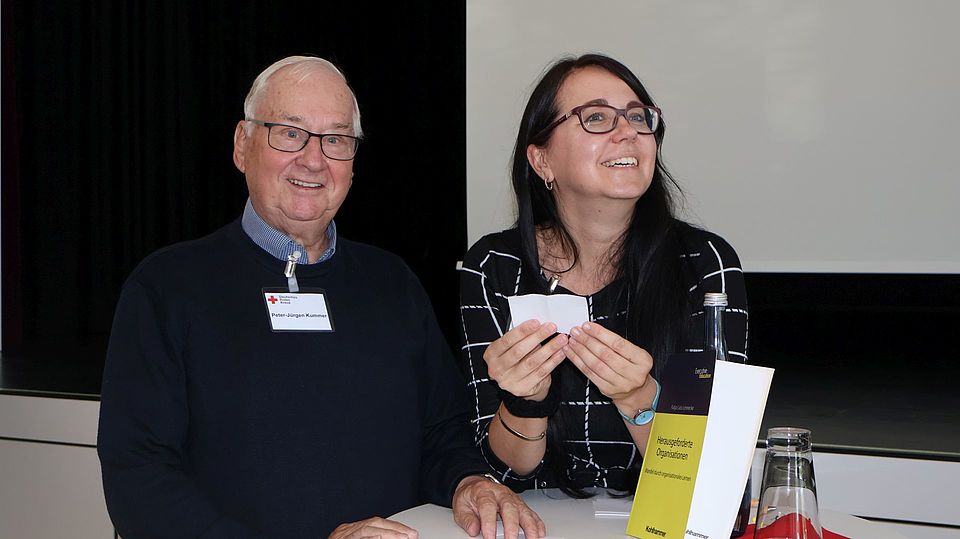 Nach der Begrüßung durch Kreisverbandspräsident Peter Hofelich gab Katja Lass-Lennecke zunächst Impulse aus ihrem Buch „Herausgeforderte Organisationen: Wandel durch organisationales Lernen“ und fasste zehn konkrete Handlungsempfehlungen zusammen, die dazu beitragen können, das Rote Kreuz als lernfähige Organisation auch in Zukunft resilient und erfolgreich zu erhalten. Anschließend referierte Jana Bielick, Referentin für Digitalisierung und Soziale Innovation vom Generalsekretariat, über die besondere Rolle von Innovationen als Antwort auf neue Herausforderungen, ging der Frage nach, wie die Innovationsfähigkeit gestärkt und die anstehenden Herausforderungen der Zukunft erfolgreich gemeistert werden können.