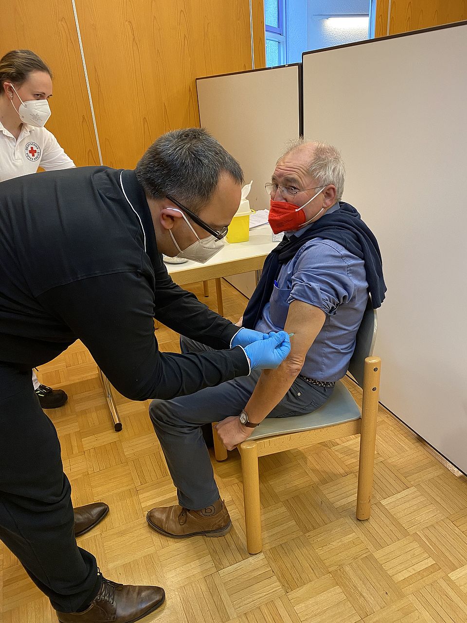 Auch Mitarbeitende der Geschäftsstelle nutzen das Angebot. Wie Michael Tomaszewski, der stellvertretende Leiter der Abteilung Sozialarbeit und seine Frau. „Das war sehr sanft“, stellte er nach dem kleinen Piks fest“. Dr. Beatrice Krauß, die die Impfung vornahm, empfahl: „Heute sollten Sie auf Ihr Hanteltraining verzichten. Falls Sie Fieber bekommen, können Sie ein übliches Schmerzmittel nehmen und vor allem müssen Sie viel trinken.“
